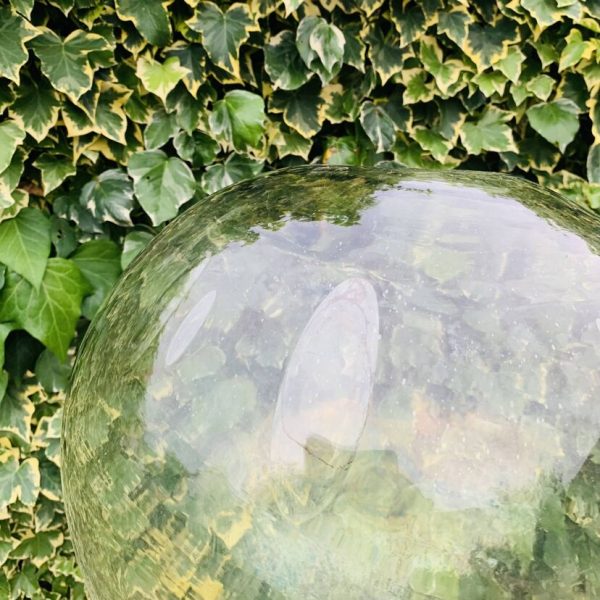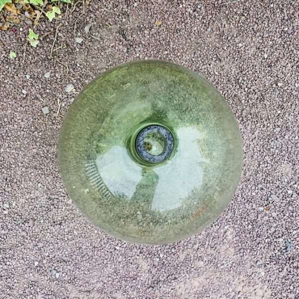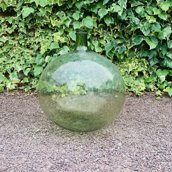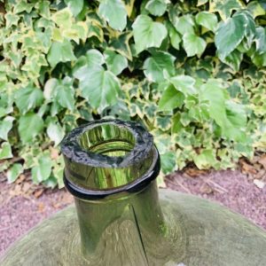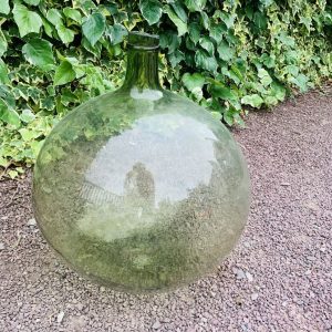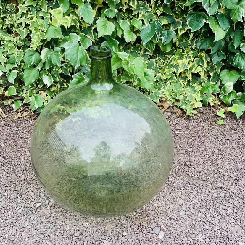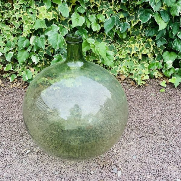Magnifique dame-jeanne ancienne, grand modèle en forme de boule, typique des fabrications artisanales d’autrefois. Son verre soufflé présente de jolies bulles d’air, témoins de son authenticité et de son charme unique.