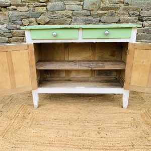 Ce charmant buffet parisien vert et blanc, plein de caractère, est un véritable coup de cœur pour les amateurs de mobilier vintage. Avec ses deux portes, ses deux tiroirs fonctionnels et ses trois étages intérieures, il offre un espace de rangement généreux tout en apportant une touche de couleur vibrante à votre intérieur. Les marques du temps, telles que des éclats de peinture et quelques décolorations, lui confèrent une authenticité et une histoire unique, faisant de ce meuble un choix parfait pour ceux qui recherchent du mobilier avec du vécu et du style- {hauteur: 80cm – largeur: 100cm – profondeur: 40cm| intérieur tiroir: hauteur: 7, 5cm – largeur: 36cm – profondeur: 30cm- intérieur: largeur: 92, 5cm 1 étagère: hauteur: 22/25, 5cm}
