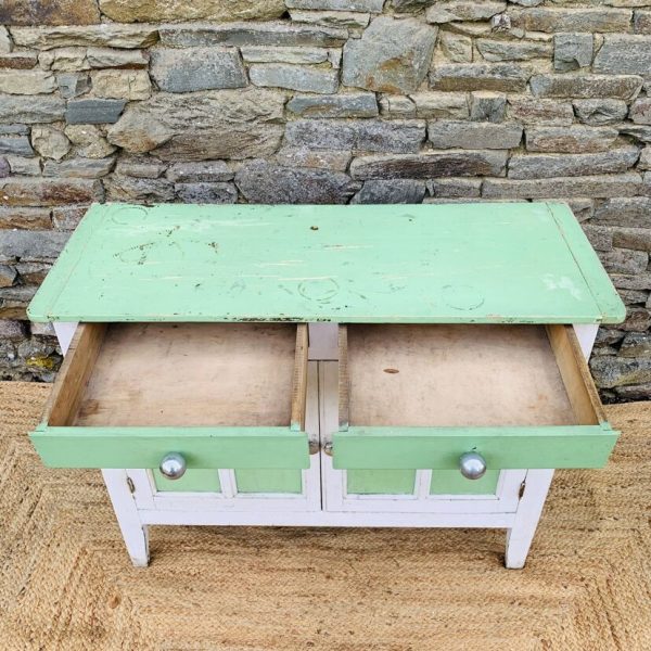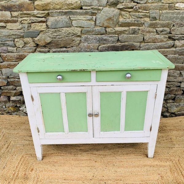 Ce charmant buffet parisien vert et blanc, plein de caractère, est un véritable coup de cœur pour les amateurs de mobilier vintage. Avec ses deux portes, ses deux tiroirs fonctionnels et ses trois étages intérieures, il offre un espace de rangement généreux tout en apportant une touche de couleur vibrante à votre intérieur. Les marques du temps, telles que des éclats de peinture et quelques décolorations, lui confèrent une authenticité et une histoire unique, faisant de ce meuble un choix parfait pour ceux qui recherchent du mobilier avec du vécu et du style- {hauteur: 80cm – largeur: 100cm – profondeur: 40cm| intérieur tiroir: hauteur: 7, 5cm – largeur: 36cm – profondeur: 30cm- intérieur: largeur: 92, 5cm 1 étagère: hauteur: 22/25, 5cm}