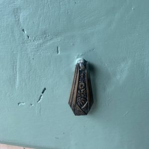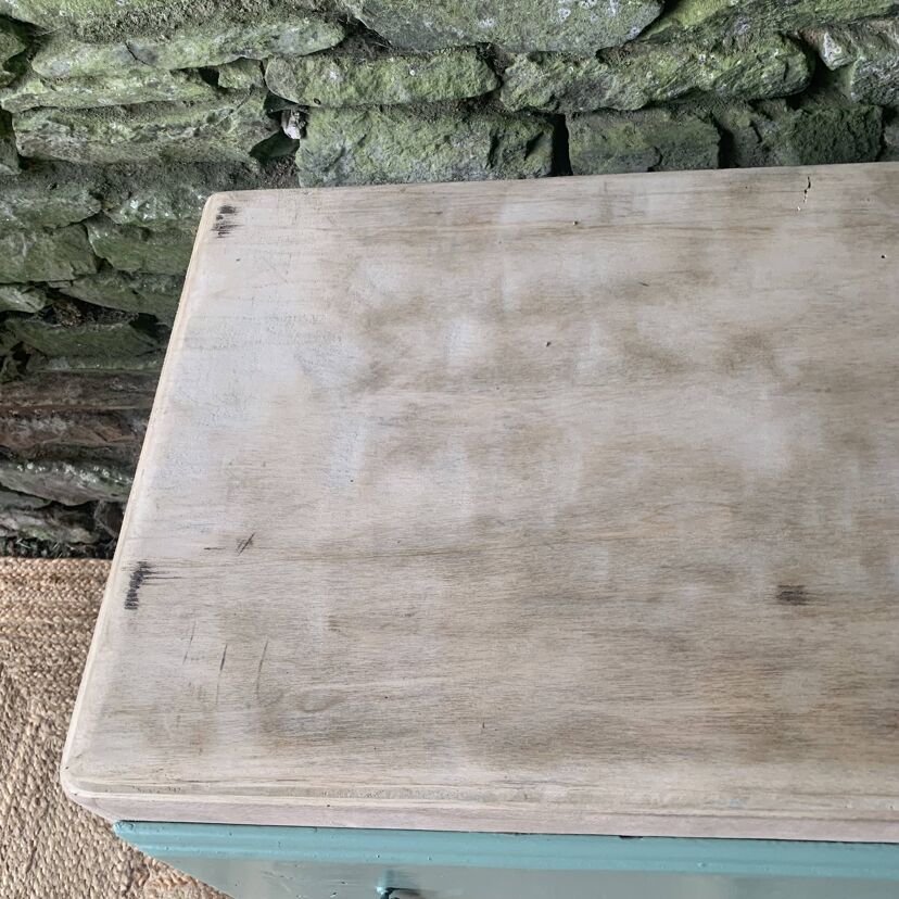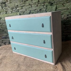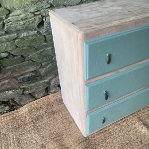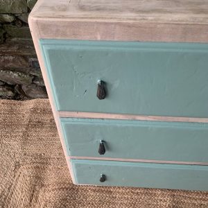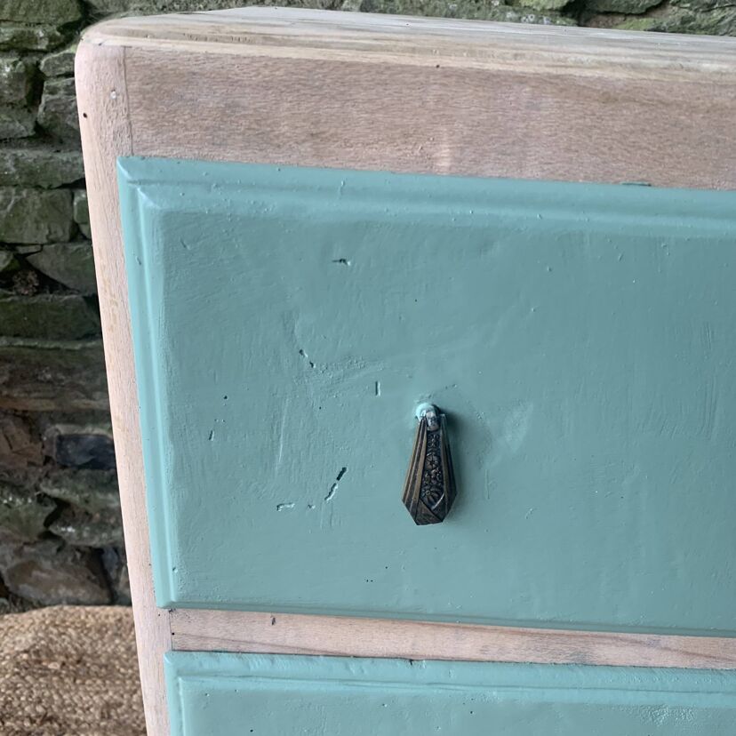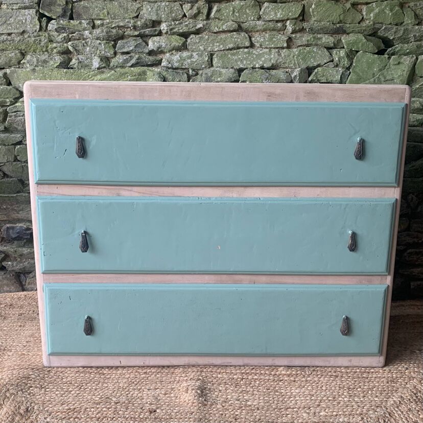 Commode vintage composée de trois grands tiroirs, encore munie de sa protection d’époque. La structure a été soigneusement poncée pour retrouver une belle teinte naturelle, tandis que les tiroirs ont été peints en vert, apportant une touche de couleur douce et harmonieuse. Les poignées d’origine ont été conservées, témoignant du charme authentique de cette pièce.
