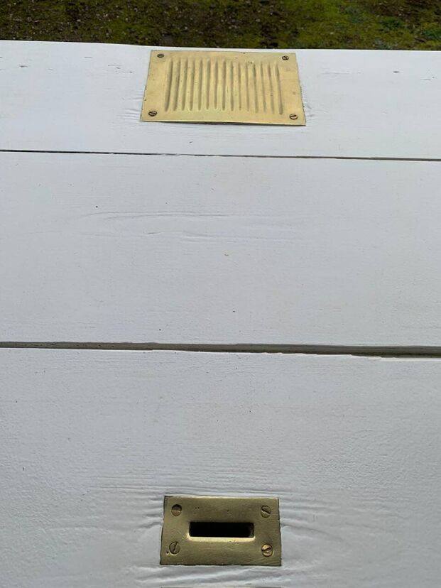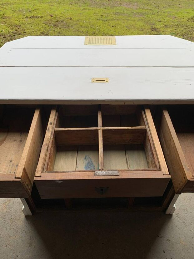 Comptoir ancien de commerce peint en blanc, doté de son monnayeur et de plaques en laiton.