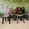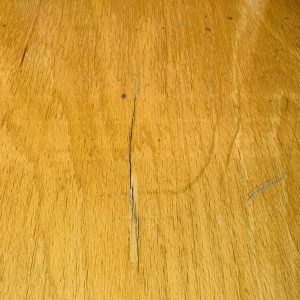 Présentent les traces naturelles du temps et de l’usage: multiples chocs dans le bois, rayures, manques de vernis, fissures sur plusieurs chaises dont une légère fissure horizontale non perforante sur l’assise d’une chaise ( aucune remise en cause de la stabilité des chaises), ainsi que quelques décolorations et frottements. Ces marques leur confèrent un charme patiné et témoignent de leur histoire.