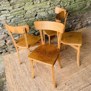 Ensemble de 4 chaises bistrot en hêtre blond, couleur miel. Esprit bistrot pur, lignes sobres et intemporelles. Chaises stables, confortables et légères, avec barres de renfort croisées assurant une bonne solidité. Leur teinte miel apporte chaleur et authenticité à tout intérieur, qu’il soit vintage, campagne ou industriel.