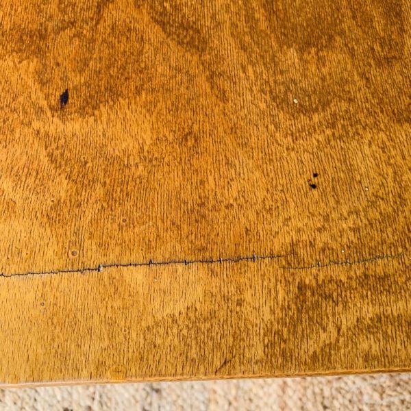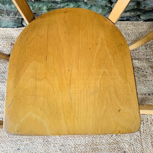 Présentent les traces naturelles du temps et de l’usage: multiples chocs dans le bois, rayures, manques de vernis, fissures sur plusieurs chaises dont une légère fissure horizontale non perforante sur l’assise d’une chaise ( aucune remise en cause de la stabilité des chaises), ainsi que quelques décolorations et frottements. Ces marques leur confèrent un charme patiné et témoignent de leur histoire.