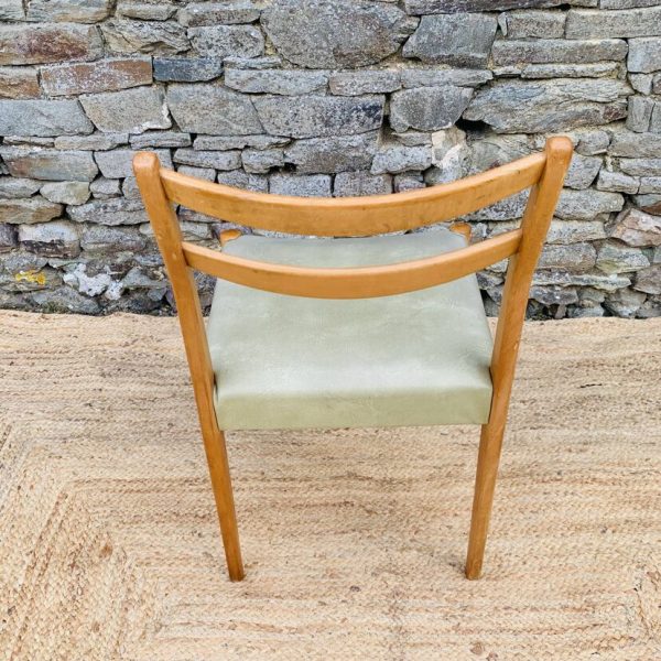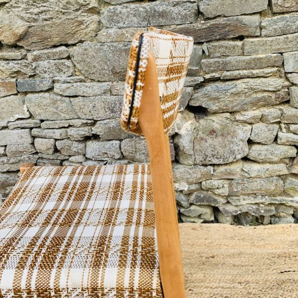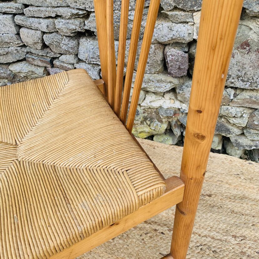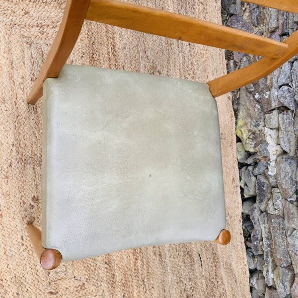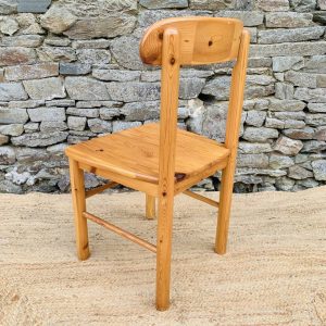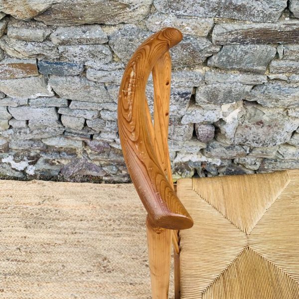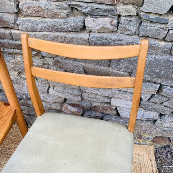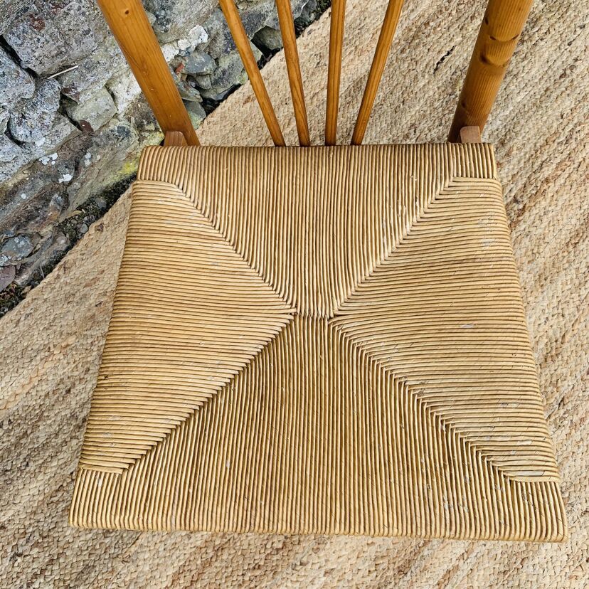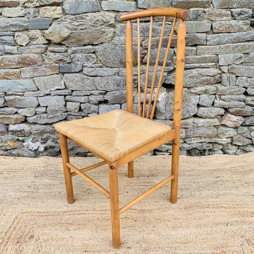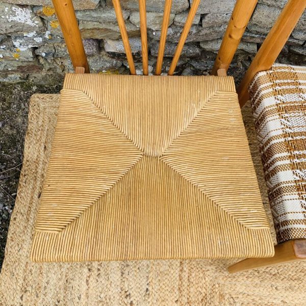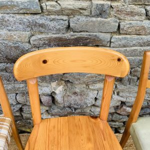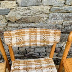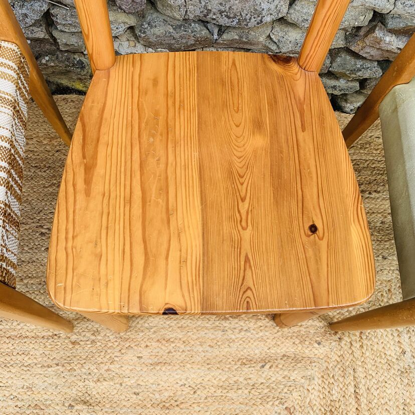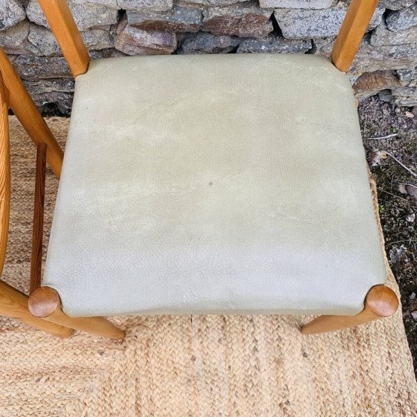 L’ensemble se compose d’une chaise en pin massif de Rainer Daumiller, d’une chaise scandinave avec assise et dossier en tissu aux tons orangés et crème, d’une chaise scandinave ou de style avec assise en paille et dossier à barreaux au design singulier, et d’une chaise scandinave avec assise en skaï vert. Un mélange subtil de matières et de formes pour un intérieur plein de personnalité – Quelques traces du temps et d’usage dont taches, rayures, décolorations, frottements, coups et autres marques