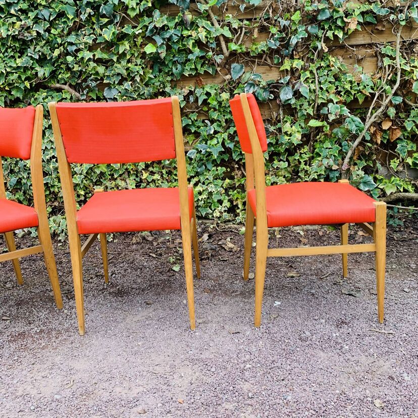 Ensemble de 4 chaises vintage en vinyle rouge des années 60, structure en hêtre blond, dossier « rembourré », les lignes rappellent les productions de Gio Ponti – Ces chaises allient confort et robustesse, idéales pour donner du caractère à votre intérieur ! – Quelques traces du temps et d’usage dont taches ( très nombreuses mini taches blanches sur le vinyle), rayures, décolorations, frottements, fissures et autres marques.