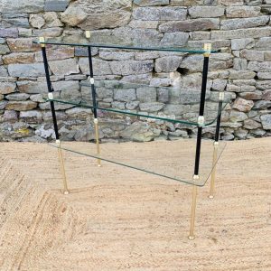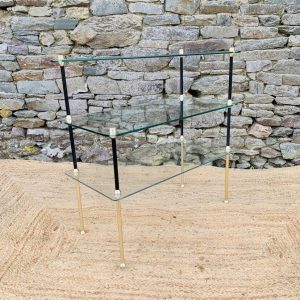 Ancien présentoir de magasin, cette pièce au design élégant se compose de trois plateaux en verre, dont le supérieur présente une forme triangulaire originale.