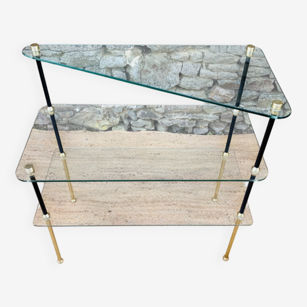 Ancien présentoir de magasin, cette pièce au design élégant se compose de trois plateaux en verre, dont le supérieur présente une forme triangulaire originale.