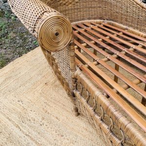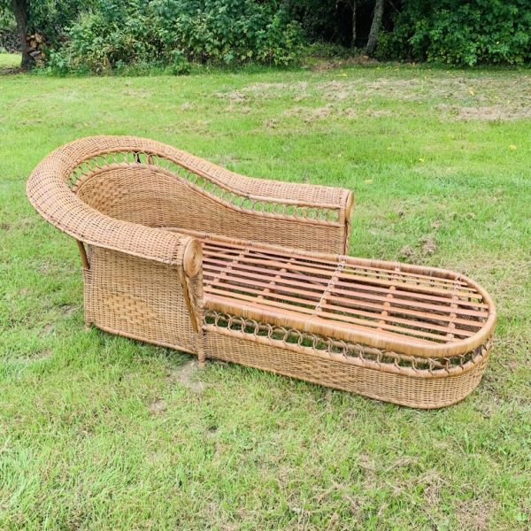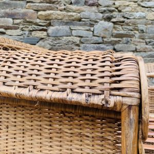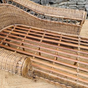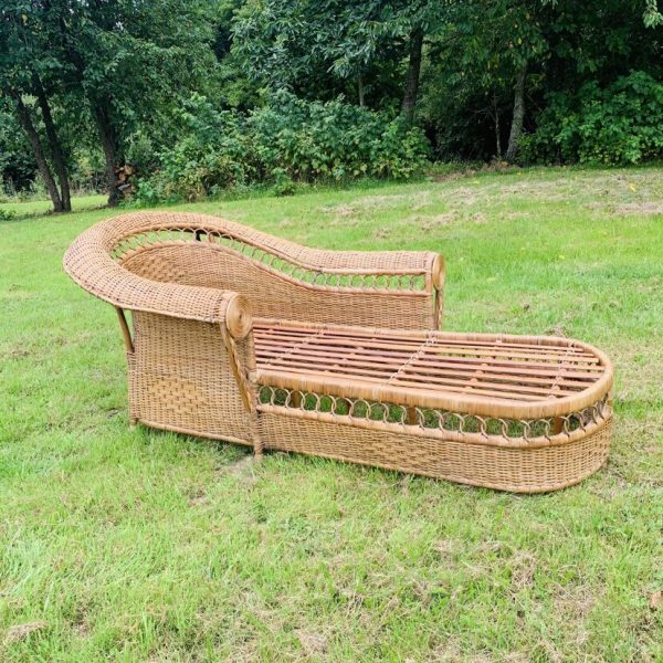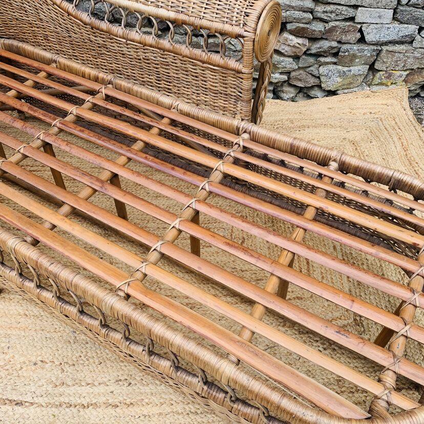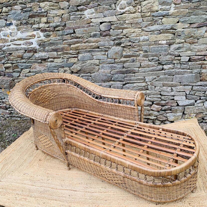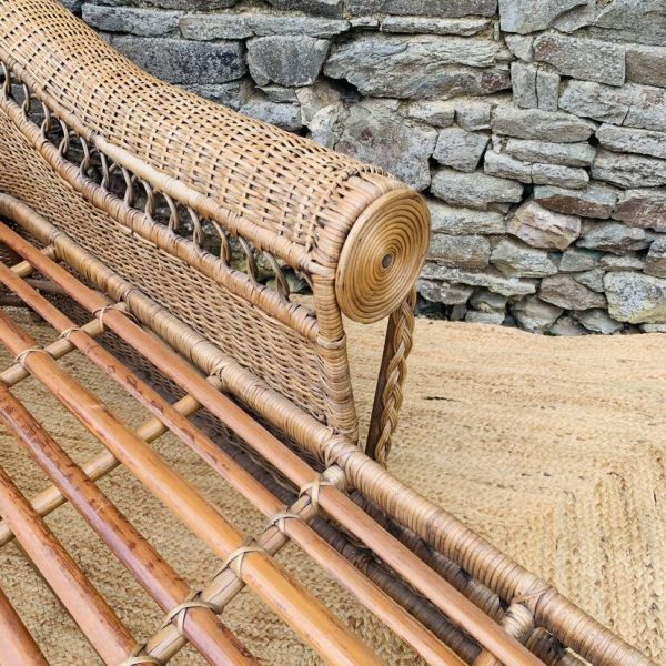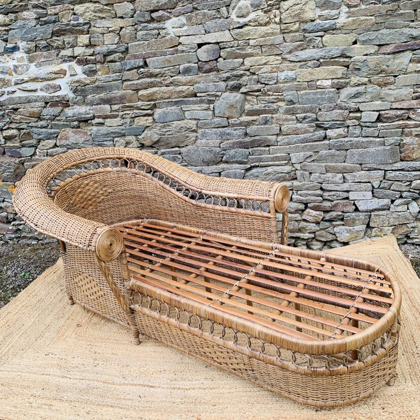 Méridienne en rotin et osier naturel, au charme authentique et intemporel. Solide et confortable, parfaite pour apporter une touche bohème ou vintage à votre intérieur ou véranda – Présente quelques traces du temps et d’usage: taches, quelques brins manquants, décolorations, frottements, coups et autres marques – Vendu avec son coussin pour plus de confort