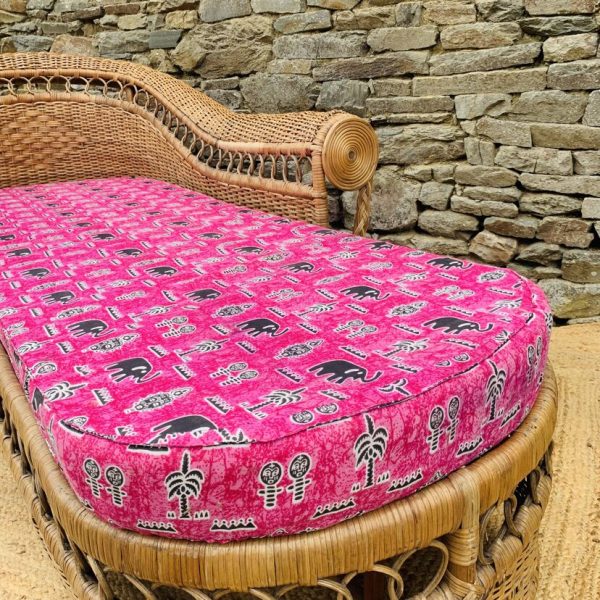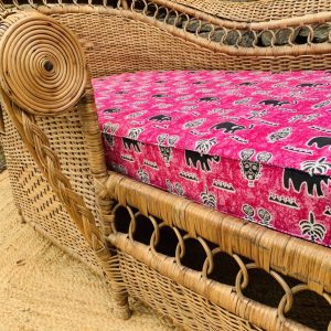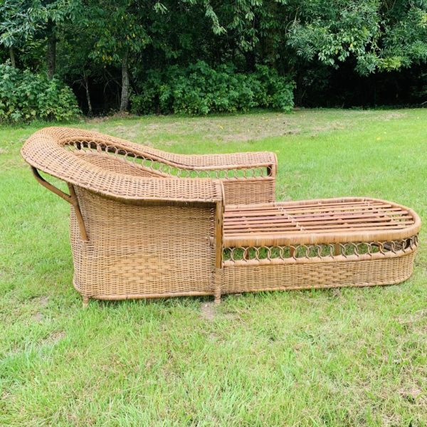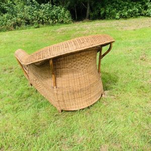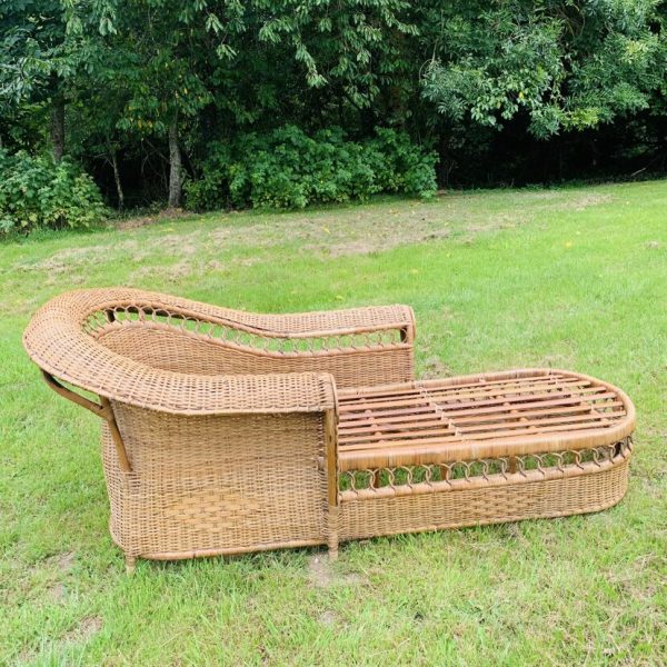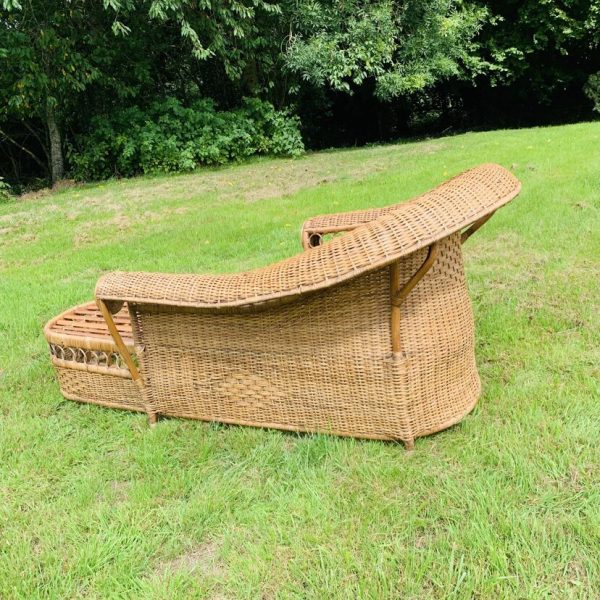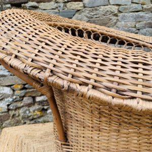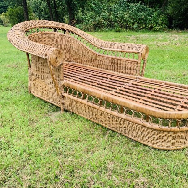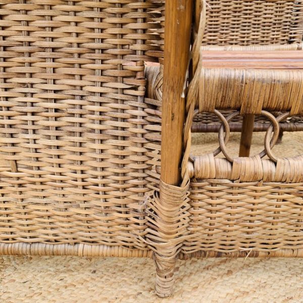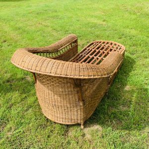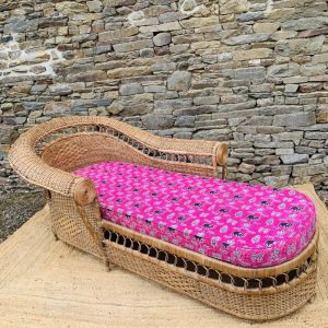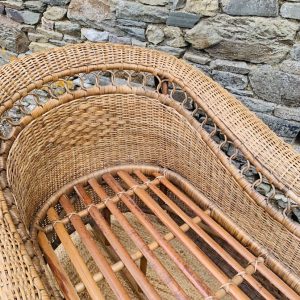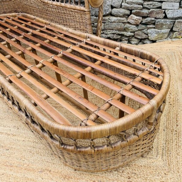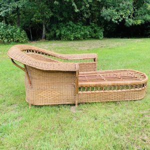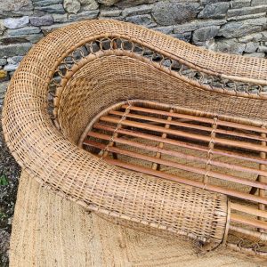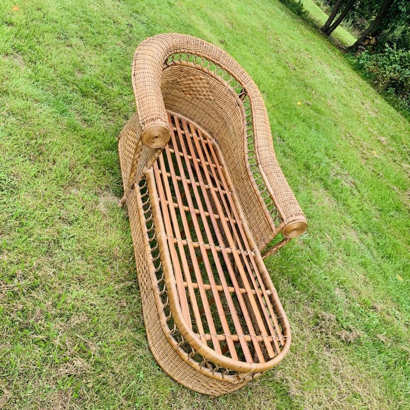 Méridienne en rotin et osier naturel, au charme authentique et intemporel. Solide et confortable, parfaite pour apporter une touche bohème ou vintage à votre intérieur ou véranda – Présente quelques traces du temps et d’usage: taches, quelques brins manquants, décolorations, frottements, coups et autres marques – Vendu avec son coussin pour plus de confort