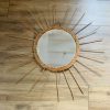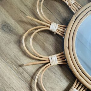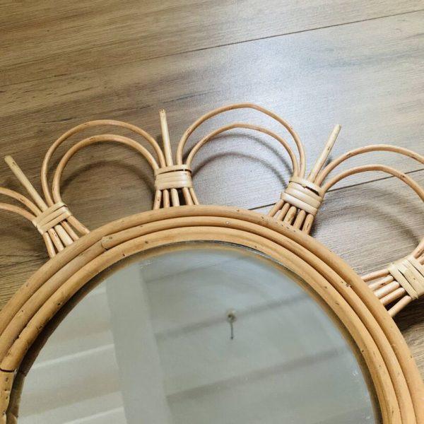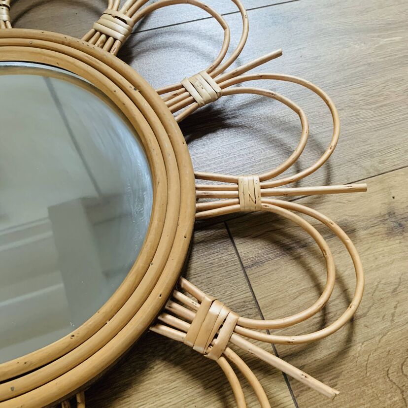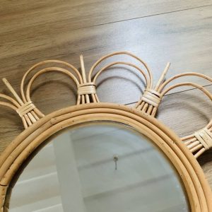 Très joli miroir mural en rotin des années 1960, au design délicat en forme de fleur typique du mobilier bohème de cette époque. Le rotin naturel présente une belle patine et quelques légères marques du temps, qui renforcent son authenticité. Grâce à sa forme originale, ce miroir apportera lumière et poésie à une entrée, un salon ou une chambre. Il s’intègre aussi bien dans un univers vintage que dans une décoration bohème chic ou scandinave. Une pièce décorative intemporelle, à la fois fonctionnelle et pleine de caractère – Quelques traces du temps et d’usage dont taches, rayures, décolorations, frottements, coups, et autres marques