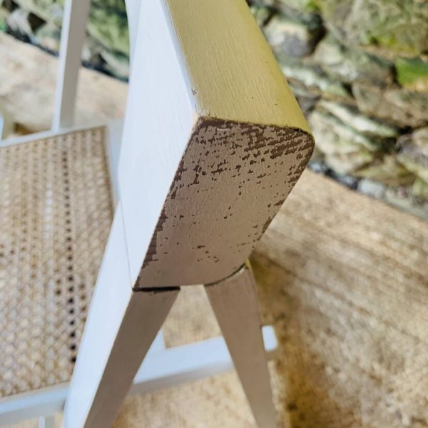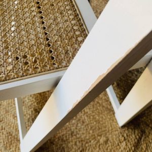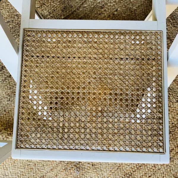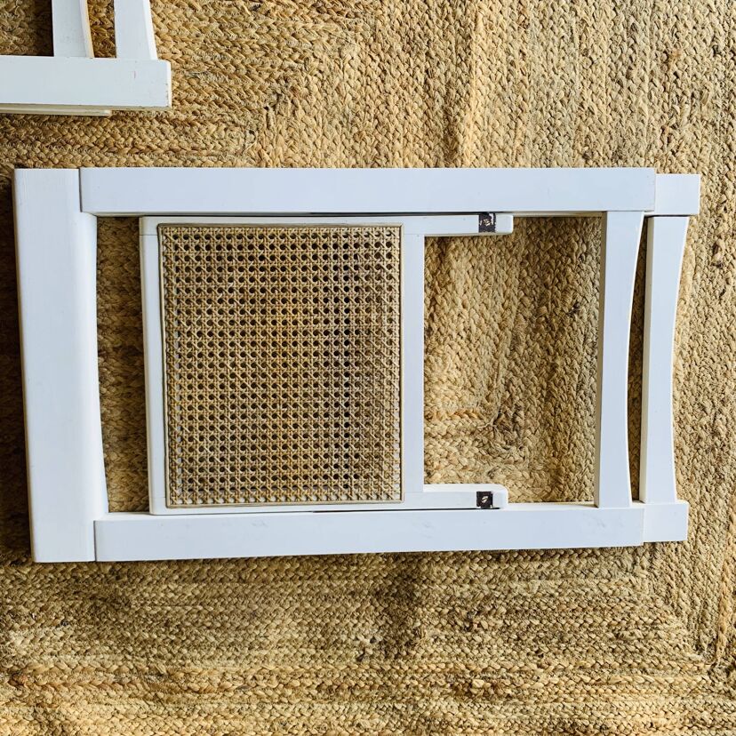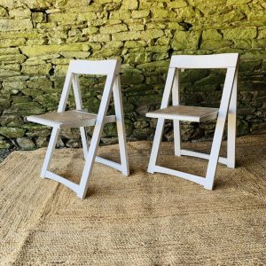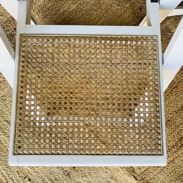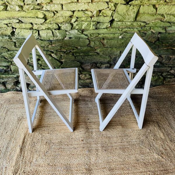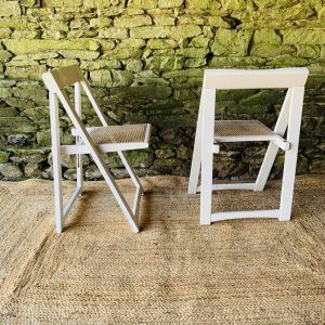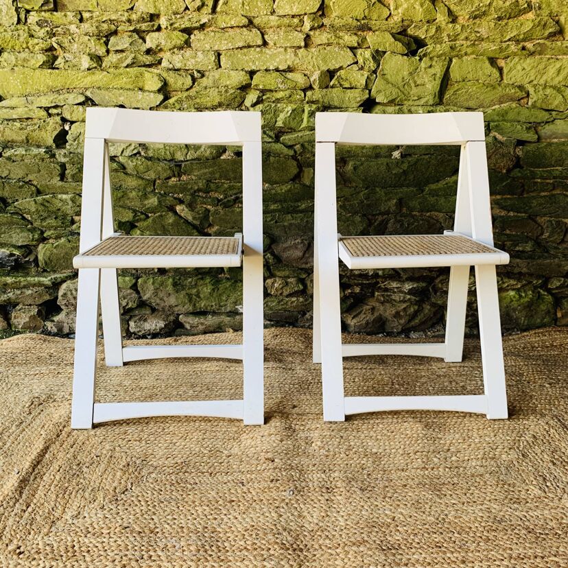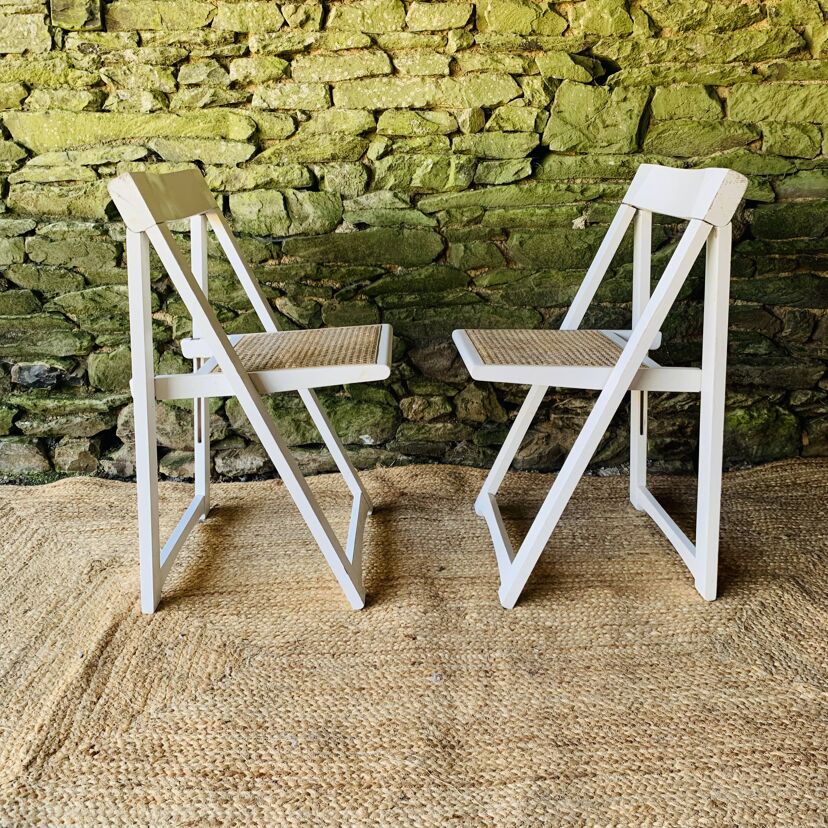 Paire de chaises pliantes Aldo Jacober en bois blanc avec assise en cannage. Leur design intemporel et fonctionnel allie élégance et praticité: elles se plient facilement pour un rangement compact, idéal dans un intérieur modulable ou un espace restreint. Modèle emblématique du design italien, ces chaises offrent un bel équilibre entre légèreté visuelle et solidité. La structure en bois peint en blanc s’accorde parfaitement avec le cannage naturel de l’assise. Une belle paire pour amateurs de design vintage et d’objets fonctionnels au style affirmé. Présentent quelques traces du temps et d’usage: taches, rayures, décolorations, frottements, petits coups… Des marques normales pour leur âge, qui n’enlèvent rien à leur charme.