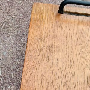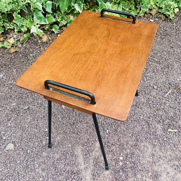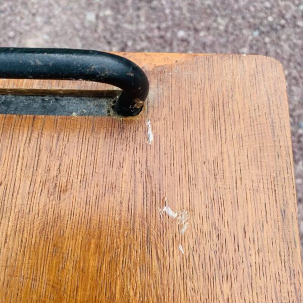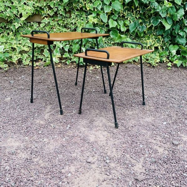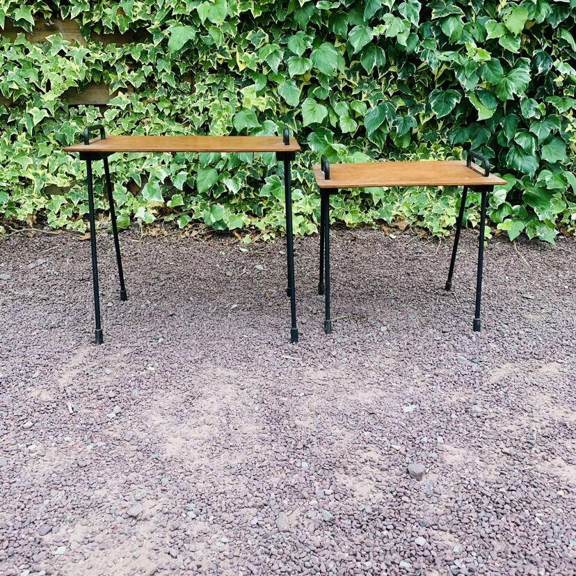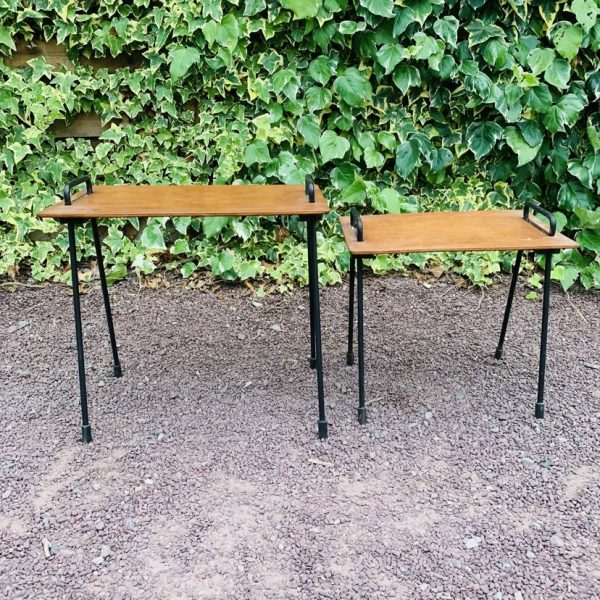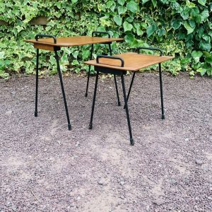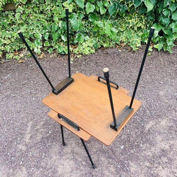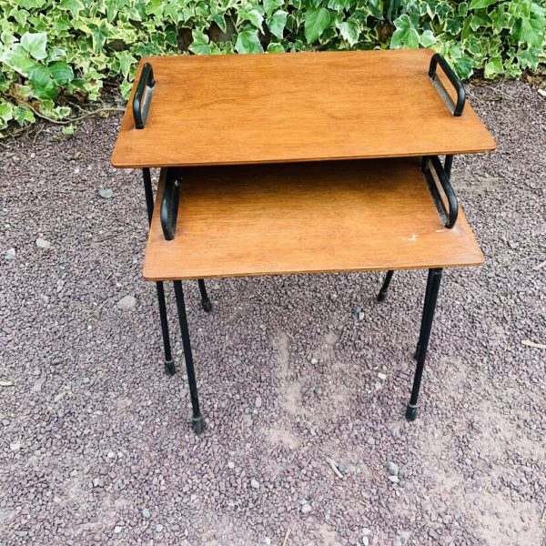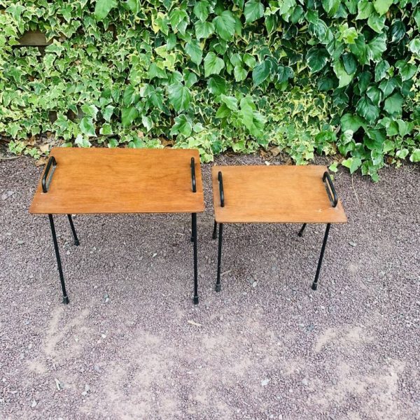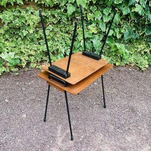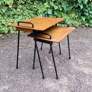 Très jolie paire de tables gigognes modernistes des années 60, combinant plateaux en bois et structures en métal tubulaire noir. Leur design épuré et fonctionnel évoque clairement le travail de Jacques Hitier, figure emblématique du mobilier de l’après-guerre – Ces tables, élégantes et pratiques, s’imbriquent l’une sous l’autre, offrant un gain de place tout en apportant une touche vintage chic à votre intérieur. Elles s’intègrent aussi bien dans un salon, un bureau ou une chambre au style mid-century, industriel ou contemporain- Quelques traces du temps et d’usage dont taches, rayures, décolorations, frottements, coups, et autres marques