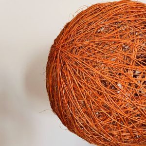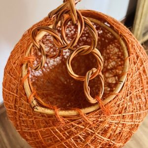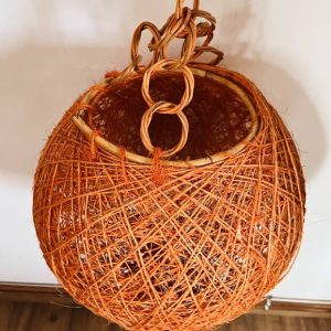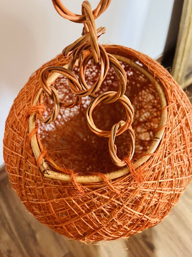Belle suspension boule en rotin orange typique des années 70, au look rétro très marqué.