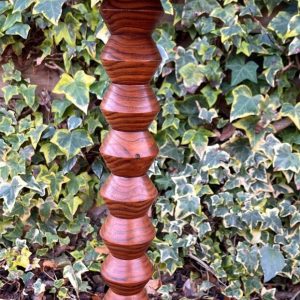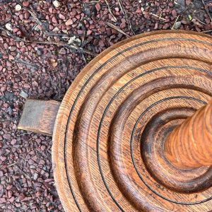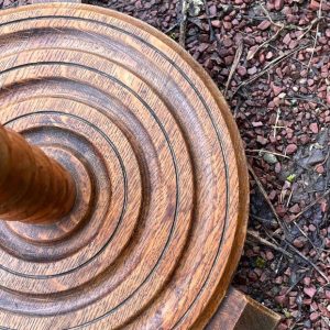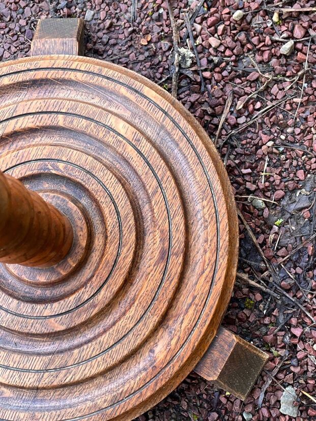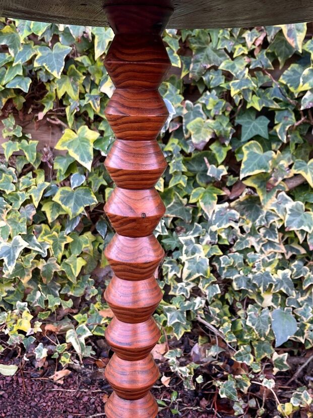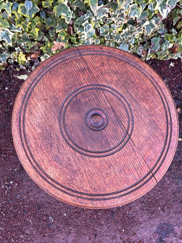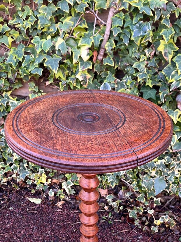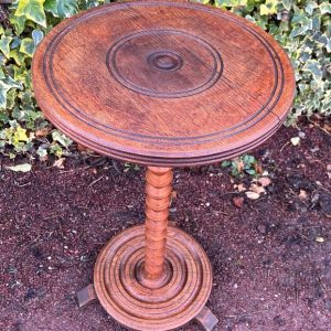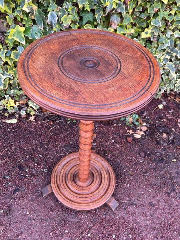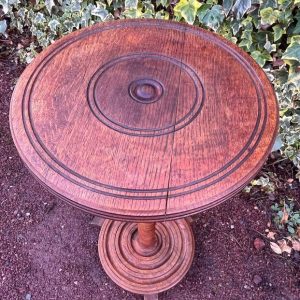 Charmante desserte ronde en bois, au piètement central finement tourné et au plateau délicatement décoré de cercles incrustés.