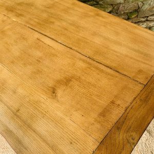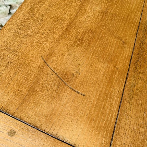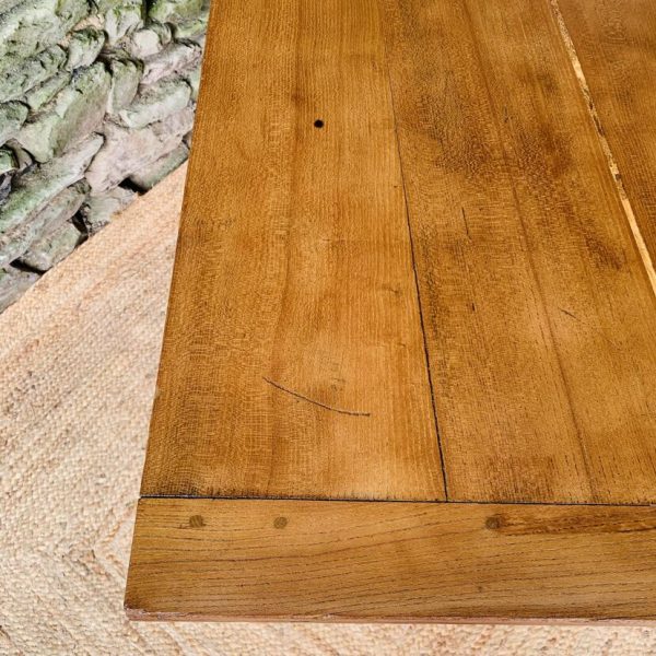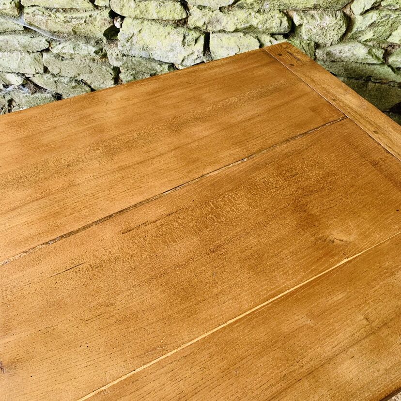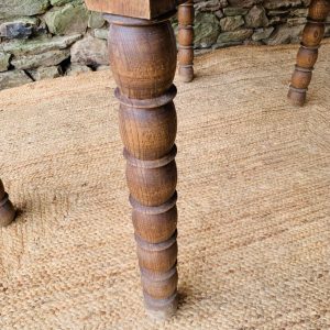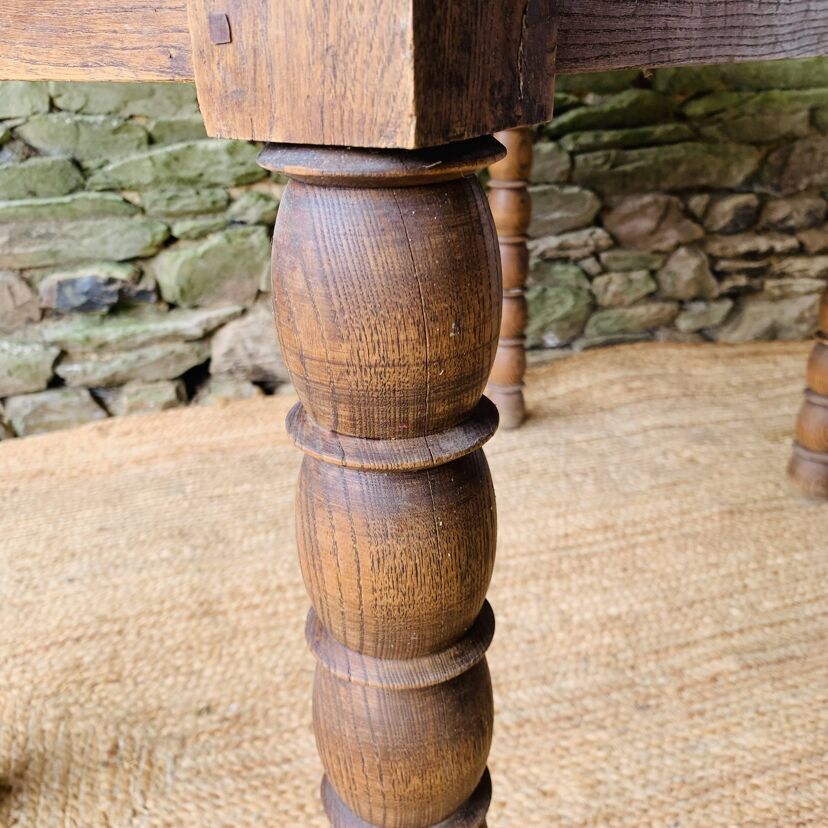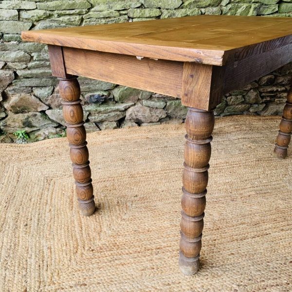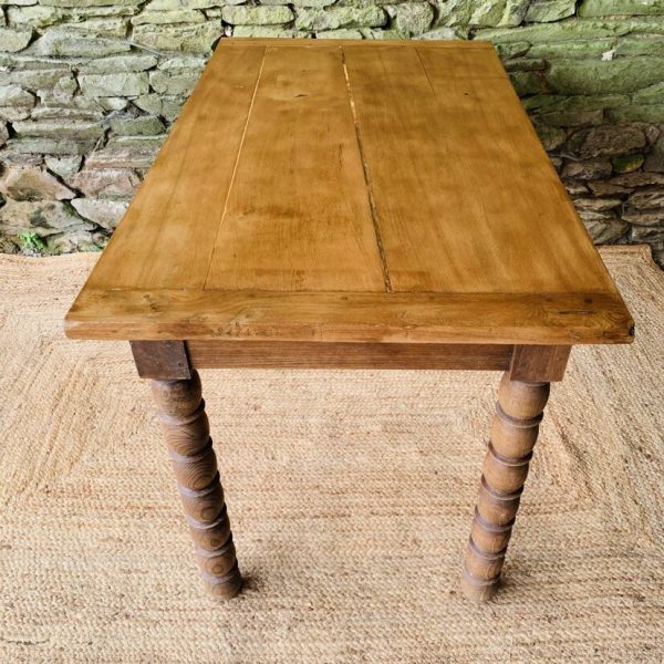 Élégante table en bois massif reposant sur quatre pieds bobines tournés, typiques du mobilier ancien. Son plateau présente une jolie patine marquée par le temps, avec quelques traces d’usage qui soulignent son authenticité. Solide et pleine de charme, elle peut servir de table de salle à manger, de bureau ou de table d’appoint dans une déco vintage ou campagne chic – Quelques traces du temps et d’usage dont taches, rayures, décolorations, frottements, coups, et autres marques