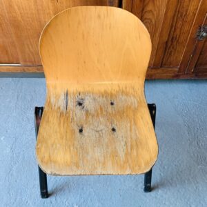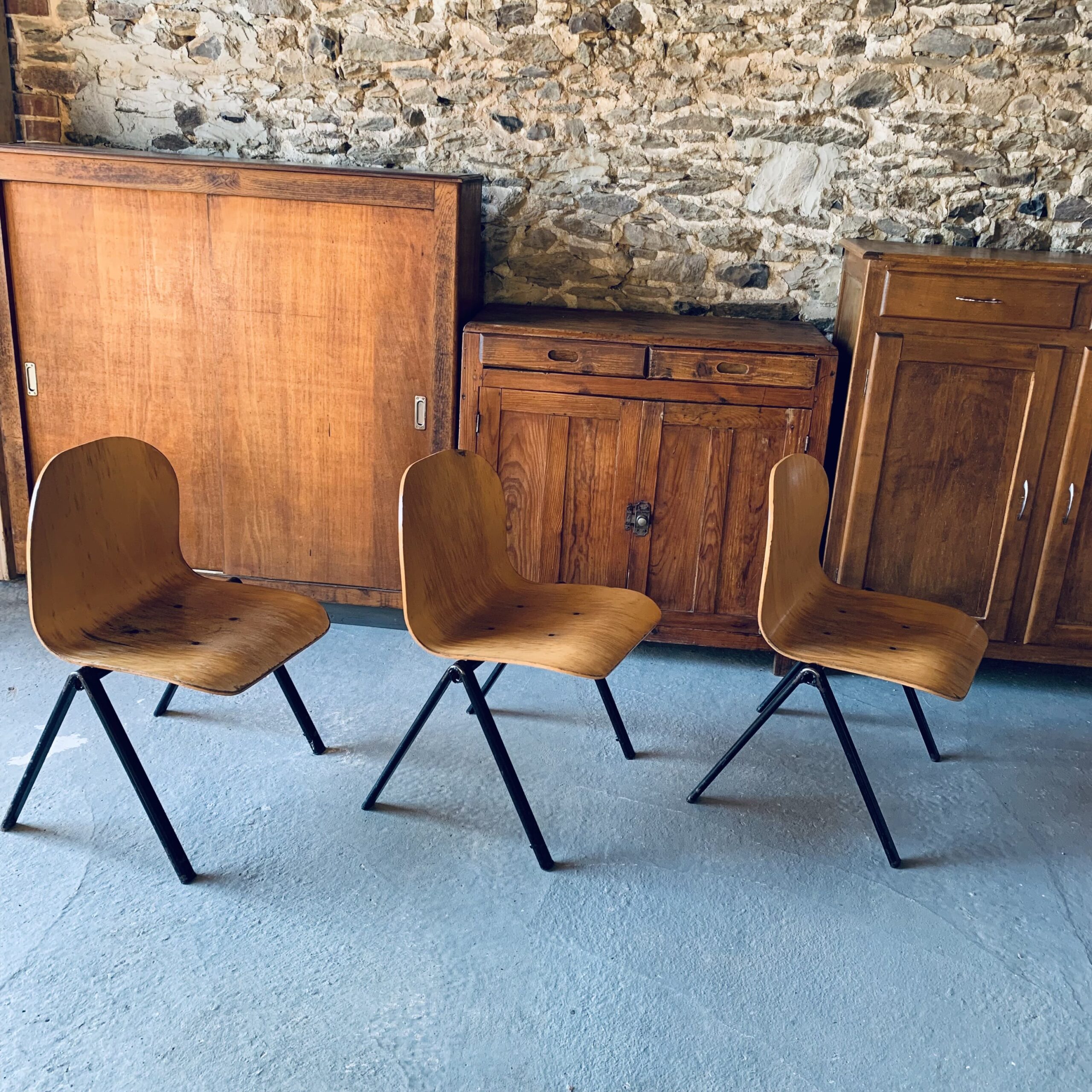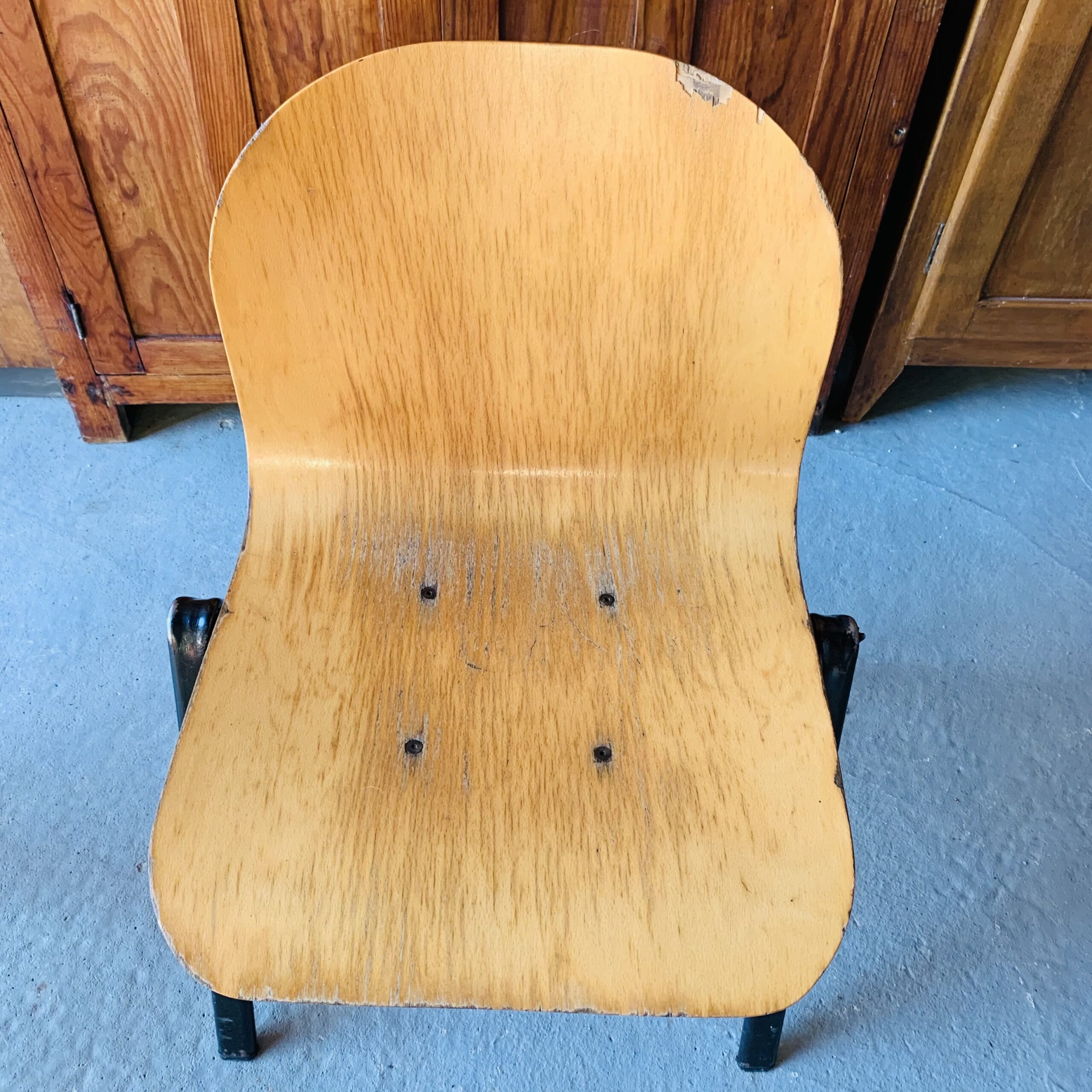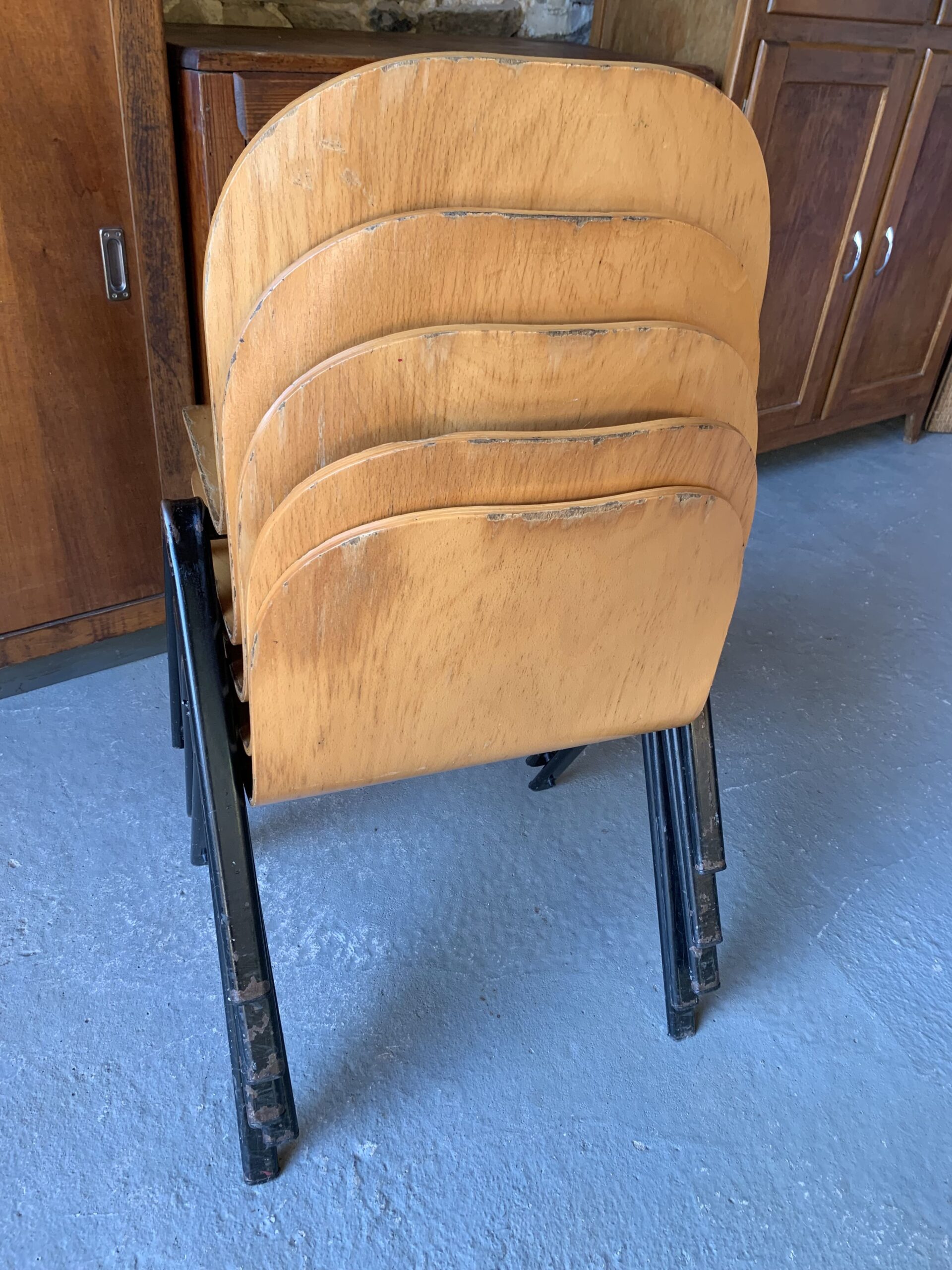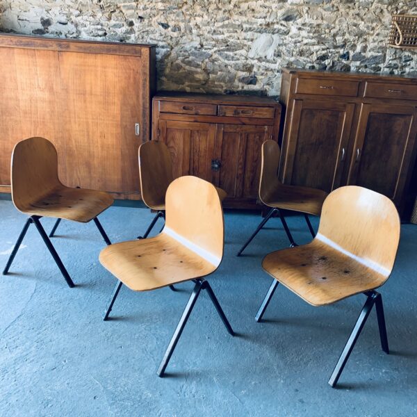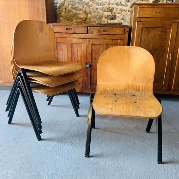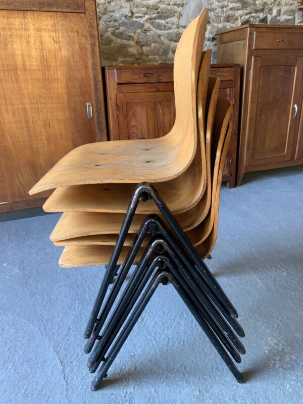 5 design chairs – Very solid structure in black curved metal – Seat and backrest in curved wood – Stackable chairs – Multiple traces / marks of time, use and wear: in places scratches, knocks, plywood jumps, discolorations, lack of black paint – These chairs come from a school; it was a donation from the local design store – {seat height: 42cm – seat depth: 38cm – height: 78cm – width: 54cm – depth: 52cm} –