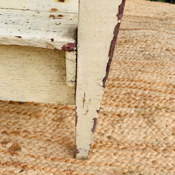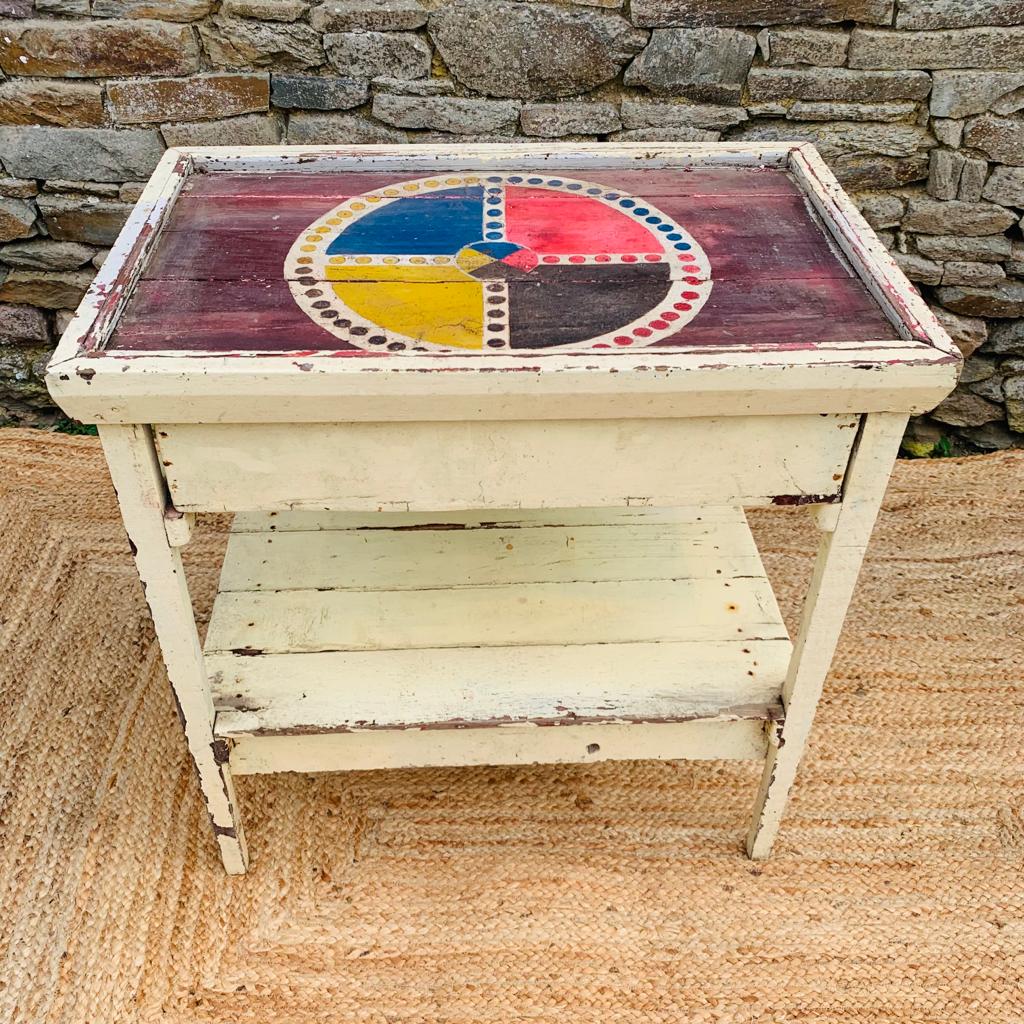 Très joli meuble d’appoint qui servait de plateau de jeu- Il est composé d’un tiroir et d’une tablette – Les couleurs du plateau sont encore très vives, meuble qui a la patine de plusieurs vies – Traces du temps et d’usage dont taches, rayures, fissures , décolorations, frottements, coups, manques de bois, nombreux trous de vers et autres marques- Meuble traitée contre les vers – Meuble très légèrement bancal