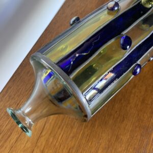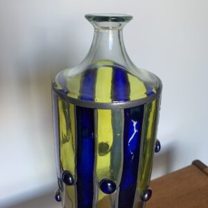 Très jolie bouteille en verre peinte avec cloisonnement en étain et boutons en verre – Bouteille aux couleurs vives, très décoratives – Traces du temps et d’usage dont craquelure ou absence de peinture