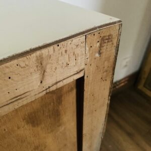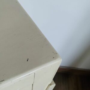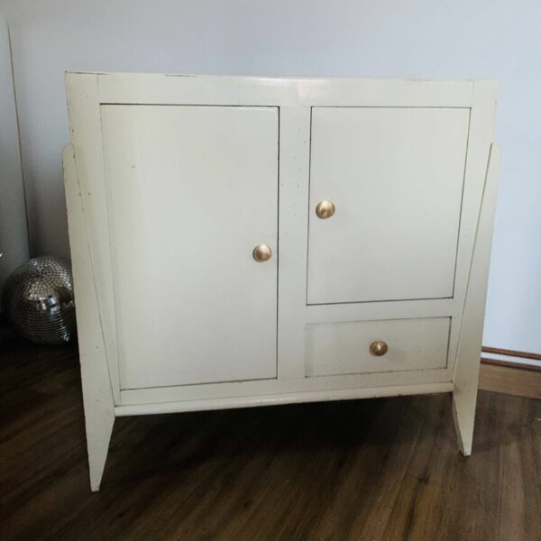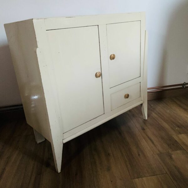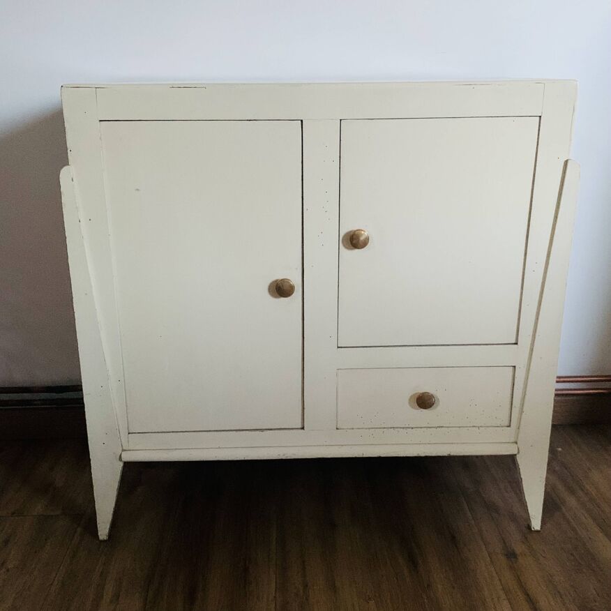 Meuble blanc parisien très atypique, une pièce unique qui saura apporter du caractère et de l’élégance à votre intérieur. Ce meuble se distingue par ses ouvertures originales: des détails uniques qui attirent le regard – Les lignes du piétement: un design raffiné et plein de personnalité – Un véritable coup de cœur pour les amateurs de meubles de charme et d’authenticité. Idéal pour sublimer une chambre, un salon ou une entrée, il allie praticité et esthétique intemporelle – Quelques traces du temps et d’usage dont, décolorations, frottements, coups, trous de vers et autres marques – Trous de vers mais meuble traité à l’arrivée à notre atelier – Bon état général – {hauteur: 82cm – largeur: 84cm – profondeur: 41cm}
