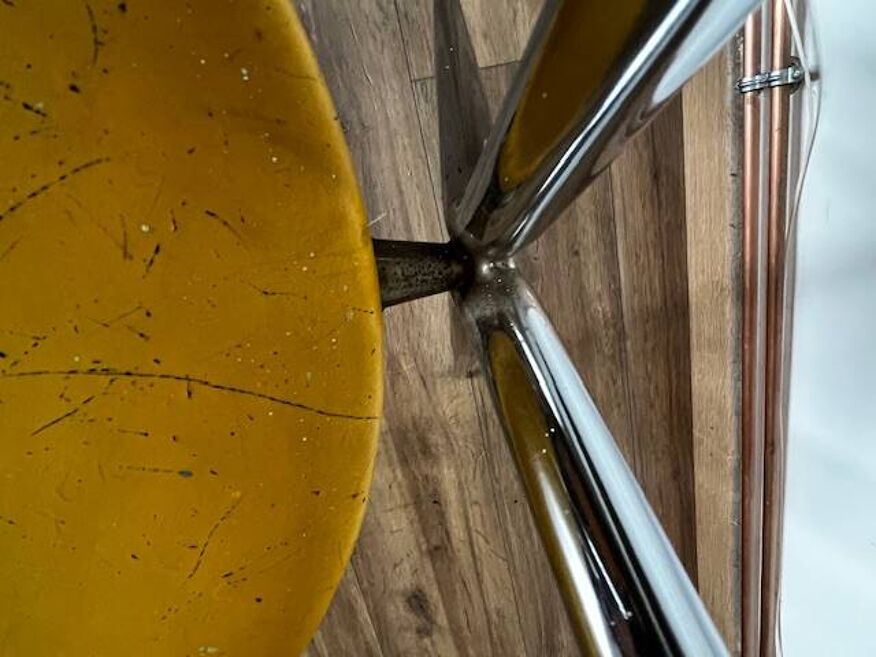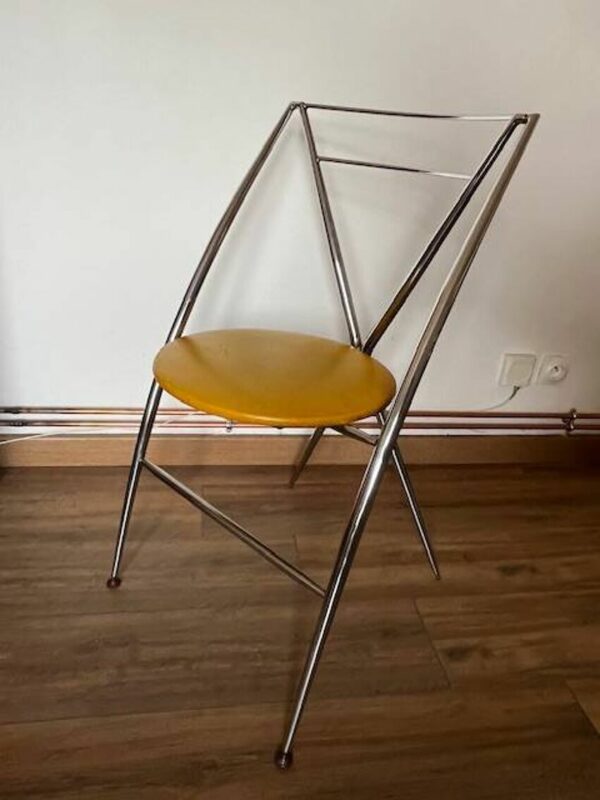 Découvrez cette chaise pliante yamakado, une pièce de design iconique qui allie élégance et fonctionnalité. Sa structure en chrome, d’une grande finesse avec ses courbes élégante, contraste superbement avec l’assise en skaï jaune vif, offrant une touche rétro unique. Bien que marquée par les traces du temps – Taches, rayures, frottements et autres marques qui ajoutent à son charme. Une acquisition parfaite pour les amateurs de design à la recherche d’une pièce qui raconte une histoire