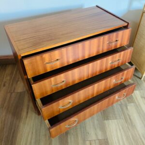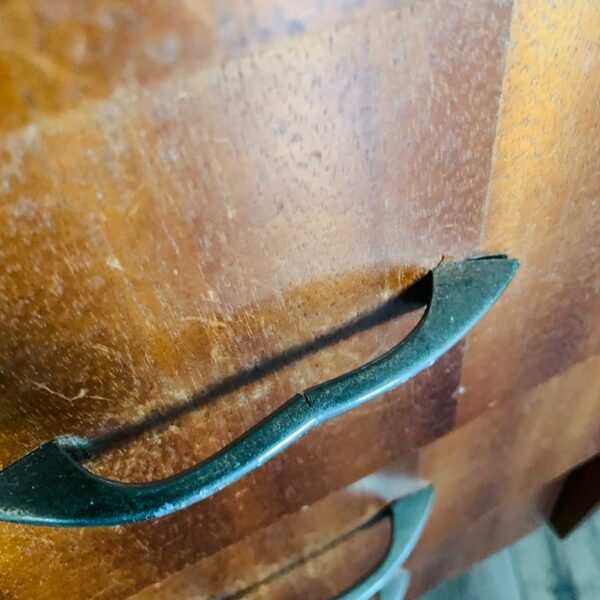 Commode 4 tiroirs des années 60/70, matériaux et courbes typique de l’époque – Belle capacité de rangement – L’intérieur des tiroirs sont propres – Poignée d’origine. – Quelques traces du temps et d’usage dont taches, rayures, griffures, décolorations, coups, frottements, divers manques de plaquage et autres marques – Une poignée pliée au centre mais solide