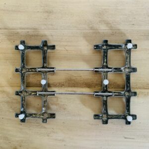 Très joli dessous de plat extensible en métal argenté imitation bambou – Quelques traces du temps et d’usage dont taches, rayures, décolorations, frottements, coups, et autres marques