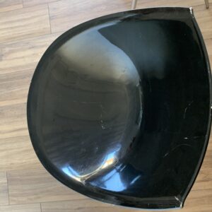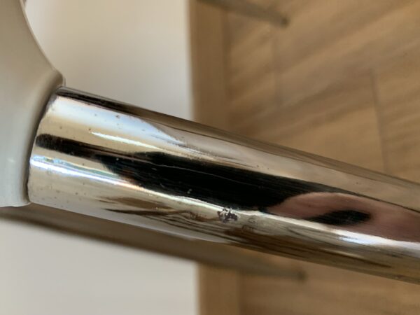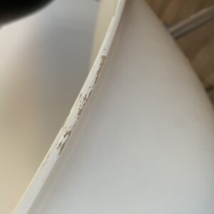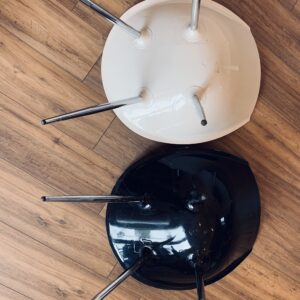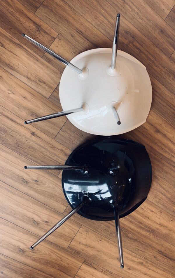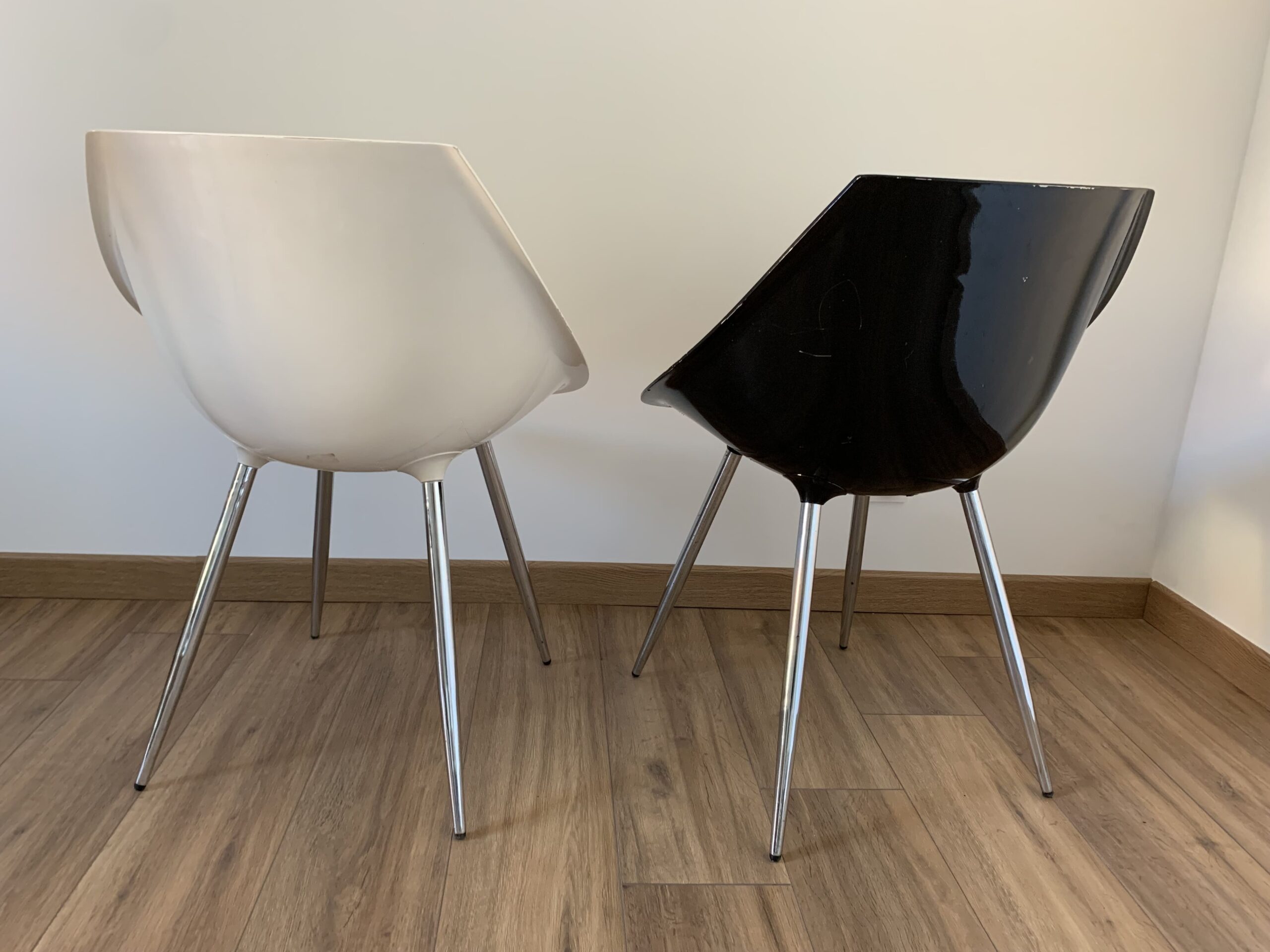 Duo of chairs in the style of Philippe Starck – Here are 2 chairs: 1 white and 1 black – its ovoid shell in lacquered polyurethane and its tapered legs give an impression of lightness to these chairs with undeniable comfort – Chromed metal legs – Presence of pads – Traces of time and use: marks of friction, numerous scratches and chips in the paint, feet with some lack of chrome and rust spots