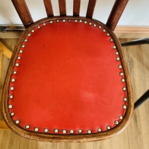 Ensemble de 4 chaises dépareillées qui ont déjà eu plusieurs vies, solides, avec des patines différentes et des petits défauts/marques pour chacune, ce qui leur donnent un charme unique – Dans le lot: 2 chaises bistrot dont une avec assise en skaï rouge, 1 chaise windsor ercol de lucien ercolani et 1 chaise d’école – Prêtes à être installées autour d’une table ou d’un bureau afin de donner un style unique à votre intérieur – Quelques traces du temps et d’usage dont taches, oxydation, rayures, décolorations, frottements, coups, fissures et autres marques