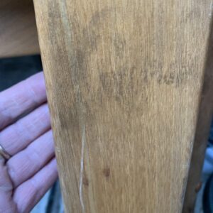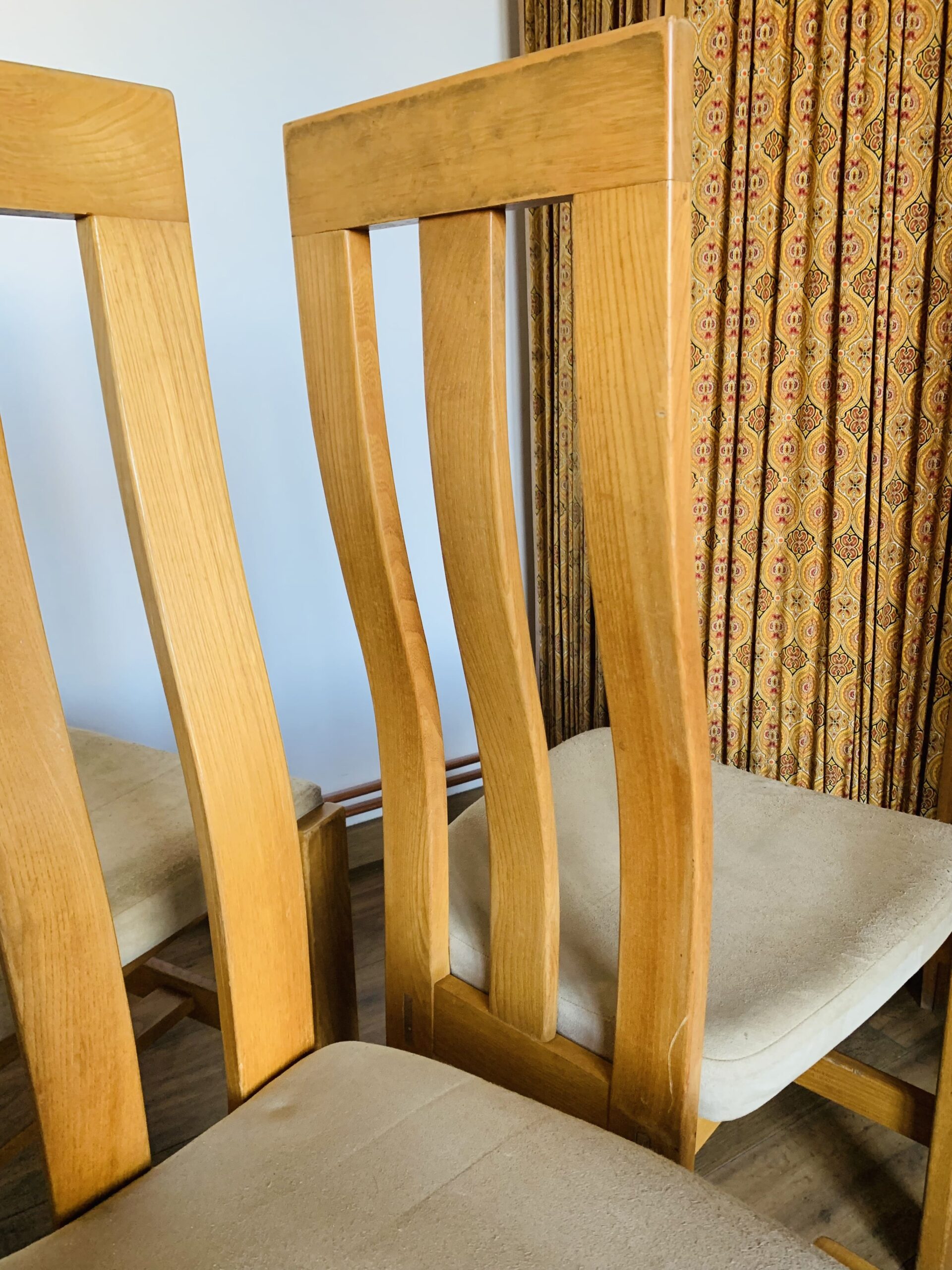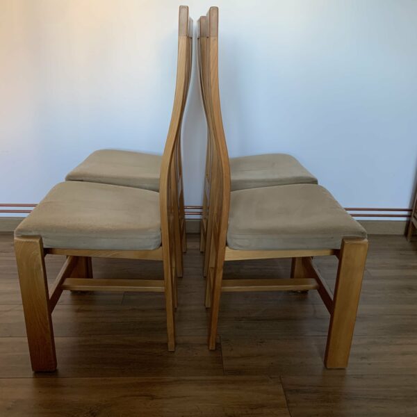 Ensemble de 4 chaises pour regain en orme massif et alcantara, vintage des années 1980 – Quelques traces du temps et d’usage dont taches, rayures, décolorations, frottements, coups, tissus des assises: bouloché et très légèrement usé et autres marques