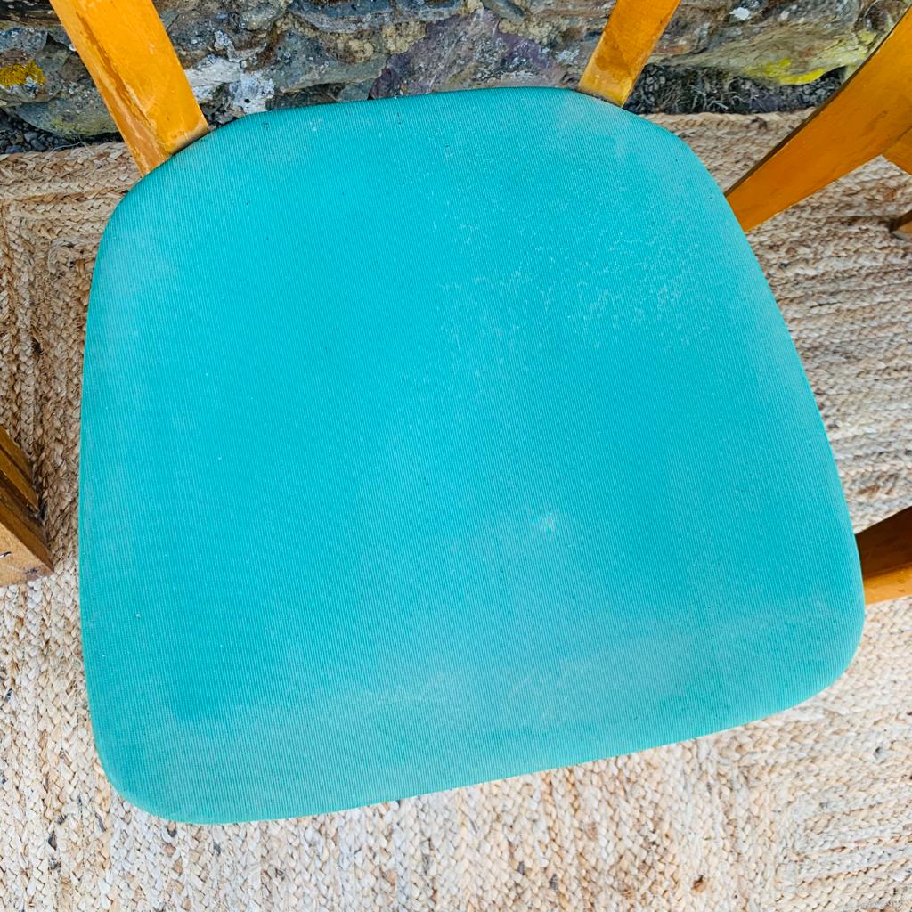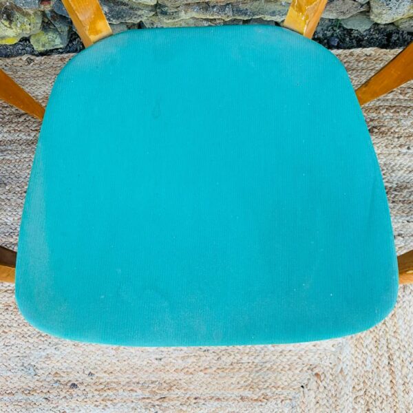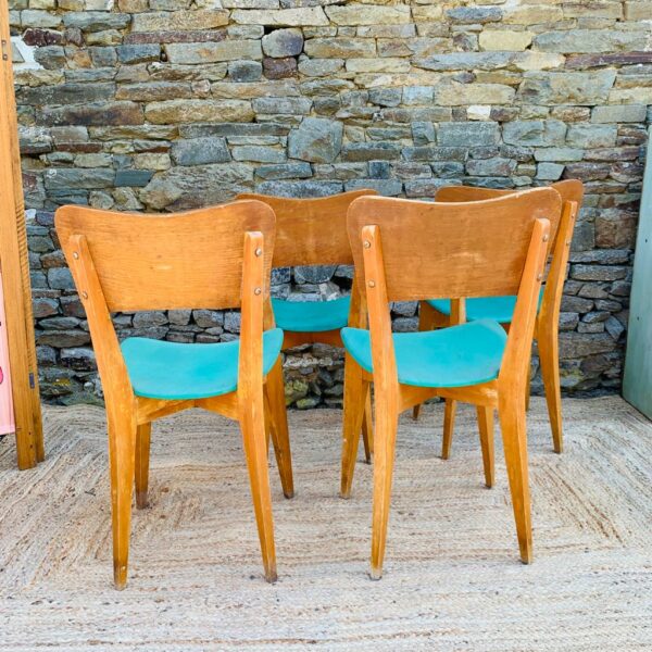 Série de 4 chaises vintage – Dossiers et structures bois, assises vinyle -Lignes intemporelles et teintes patinées – Elles sont, stables et confortables avec une assise en vinyle verte d’origine – Idéal pour un look pétillant rétro vintage – Traces du temps et d’usage : dossiers et structures avec quelques marques, rayures, coups, décolorations. Les assises vinyle sont en état moyen notamment à cause des tâches nombreuses sur certaines