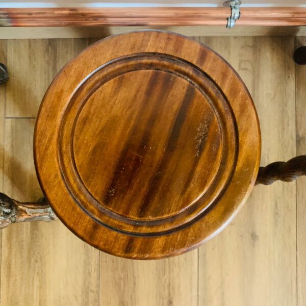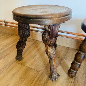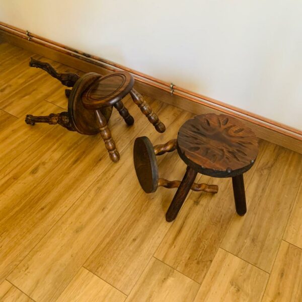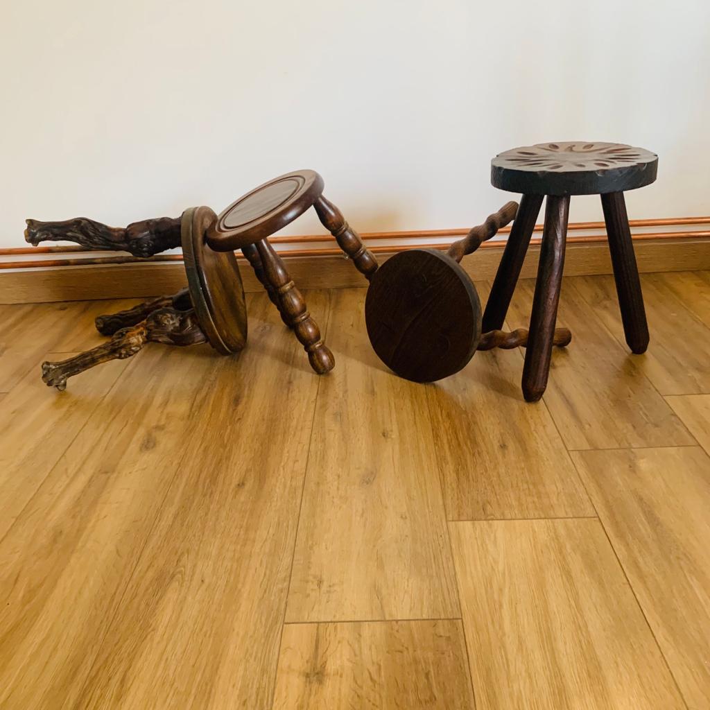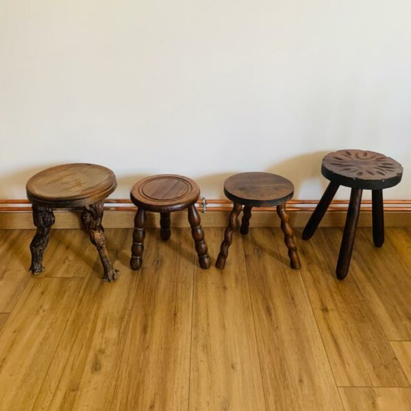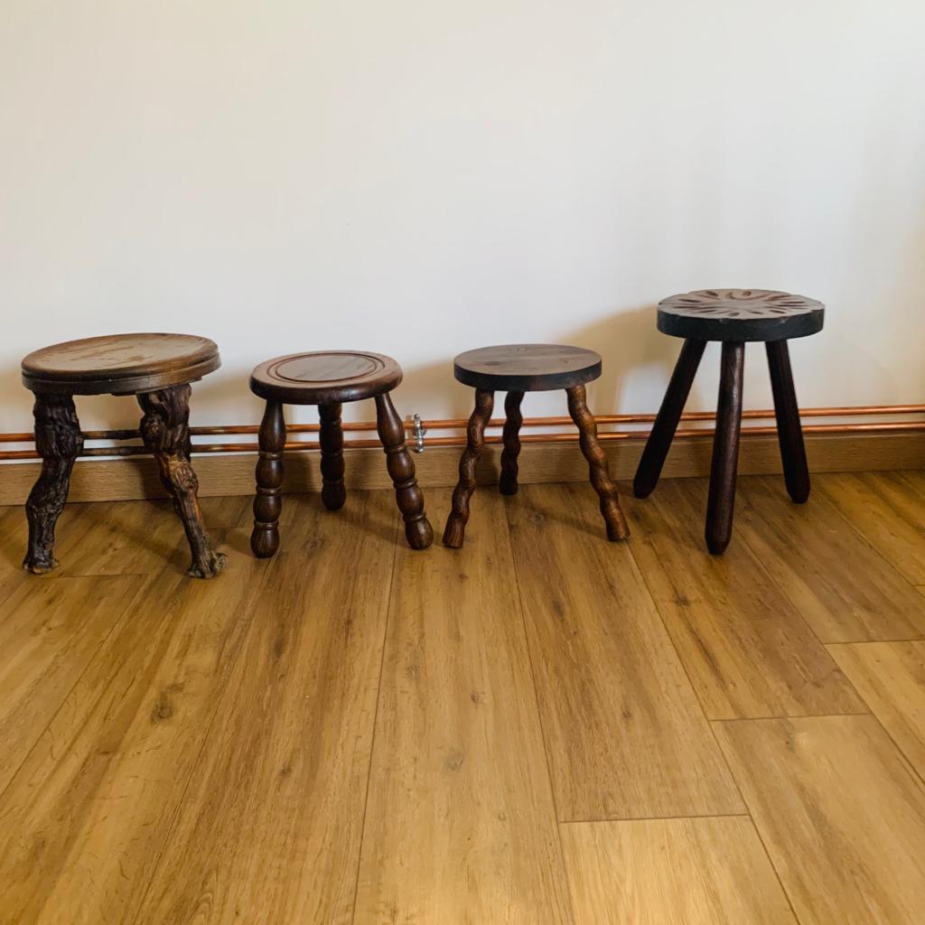 Ensemble unique de 4 tabourets tripodes en bois, chacun avec sa propre taille et forme distincte, apportant une touche singulière à votre intérieur. Ces tabourets ajouteront une dimension décorative à votre espace tout en offrant une fonctionnalité pratique – Quelques trous de vers mais le meuble a été traité à l’arrivée à notre atelier – Bon état général – Quelques traces du temps et d’usage dont taches , rayures, décolorations, frottements, fissures, coups et autres marques