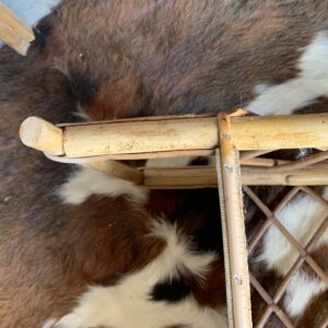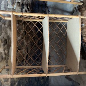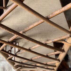 Meuble sur pieds en rotin vintage années 60 composé de 3 étagères – Une pièce pleine de charme avec ses croisillons derrière et sur les côtés – Il manque quelques agrafes aux croisillons de la partie arrière du meuble, certaines absences ont été compensées par l’ajout de vis mais sans impact sur la stabilité et la solidité du meuble, marques du temps et d’usage dont rayures, tâches sur les revêtements des étagères et autres marque.