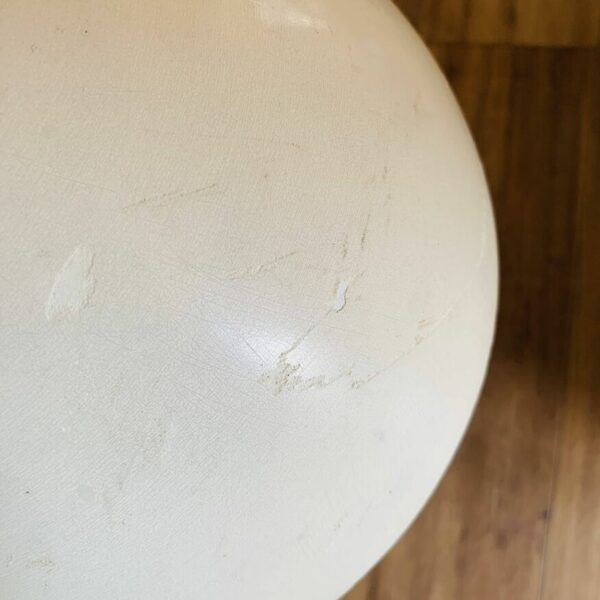 Lampe de bureau vintage par Harvey guzzini – Edition space age des années 70 par guzzini – Forme déportée originale – Piétement chromé monté sur un socle lourd en fonte noir – Couleur: blanc cassé – Quelques traces du temps dont taches, décolorations, corrosion, rayures, coups, manques de peinture et autres marques – {hauteur: 30cm – profondeur: 90cm}.