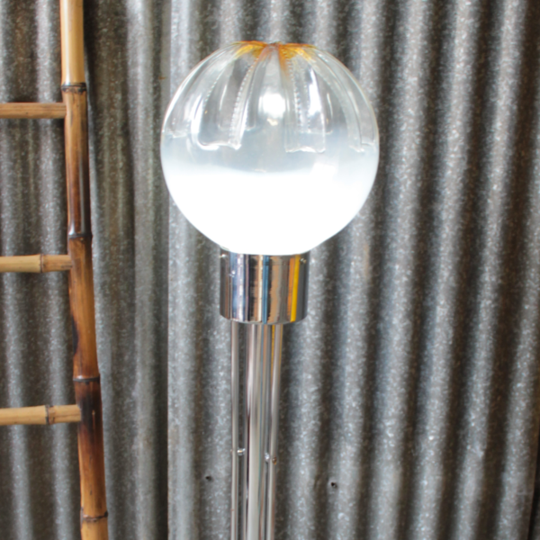 Lampadaire italien A.V. Mazzega en verre datant des années 1970. Lampe sur pied vintage avec une base en acier chromé – 1 globe en verre de Murano (Verre soufflé) du designer Carlo Nason pour Mazzega. Globe blanc avec des accents dorés/ambrés – quelques traces du temps et d’usage – l – Fonctionne - Bon état général