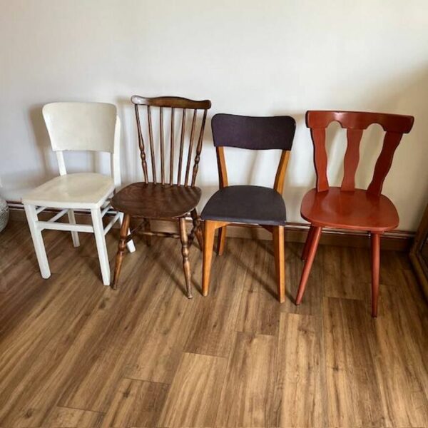 Découvrez un ensemble unique de 4 chaises dépareillées, chaque pièce racontant sa propre histoire à travers ses marques du temps. Les taches, rayures et décolorations, coups et autres marques témoignent de leur vécu, ajoutant du caractère et de l’authenticité à votre intérieur. Parfaites pour ceux qui apprécient le charme des objets avec une âme, ces chaises, structure bois, apporteront une touche vintage et éclectique à votre décoration. N’attendez plus pour inviter ces trésors au passé riche dans votre maison !