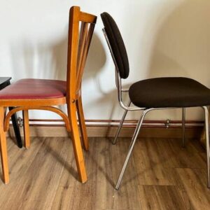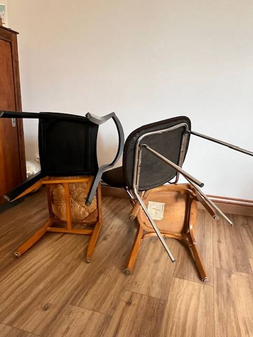 Ce lot de 4 chaises dépareillées raconte une histoire riche de caractère et de vécu. Chaque chaise, structure bois ou métal, assise paillée, simili mousse ou bois avec ses traces de temps, taches, rayures, décolorations, coupes et autres marques, ajoute une touche d’authenticité et de charme à votre intérieur. Ces marques d’usure ne sont pas des défauts, mais des témoignages de leur passé vibrant. Offrez à votre maison une pièce de conversation unique et pleine de personnalité