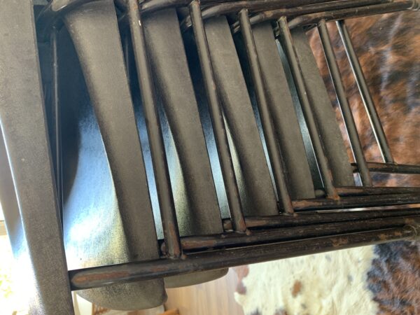 Série de 6 chaises de marque Sitting- Chaise composée d’une coque ajourée texturée imitation trame textile de couleur gris anthracite et d’un piétement métallique noir compas avec embouts pieds plastique. Chaise très confortable, dotée d’une bonne ergonomie. A noter quelques légères rayures, taches et marques sur la coque, marques et manques de peinture sur les pieds – Chaises empilables – Chaises envoyées au hasard
