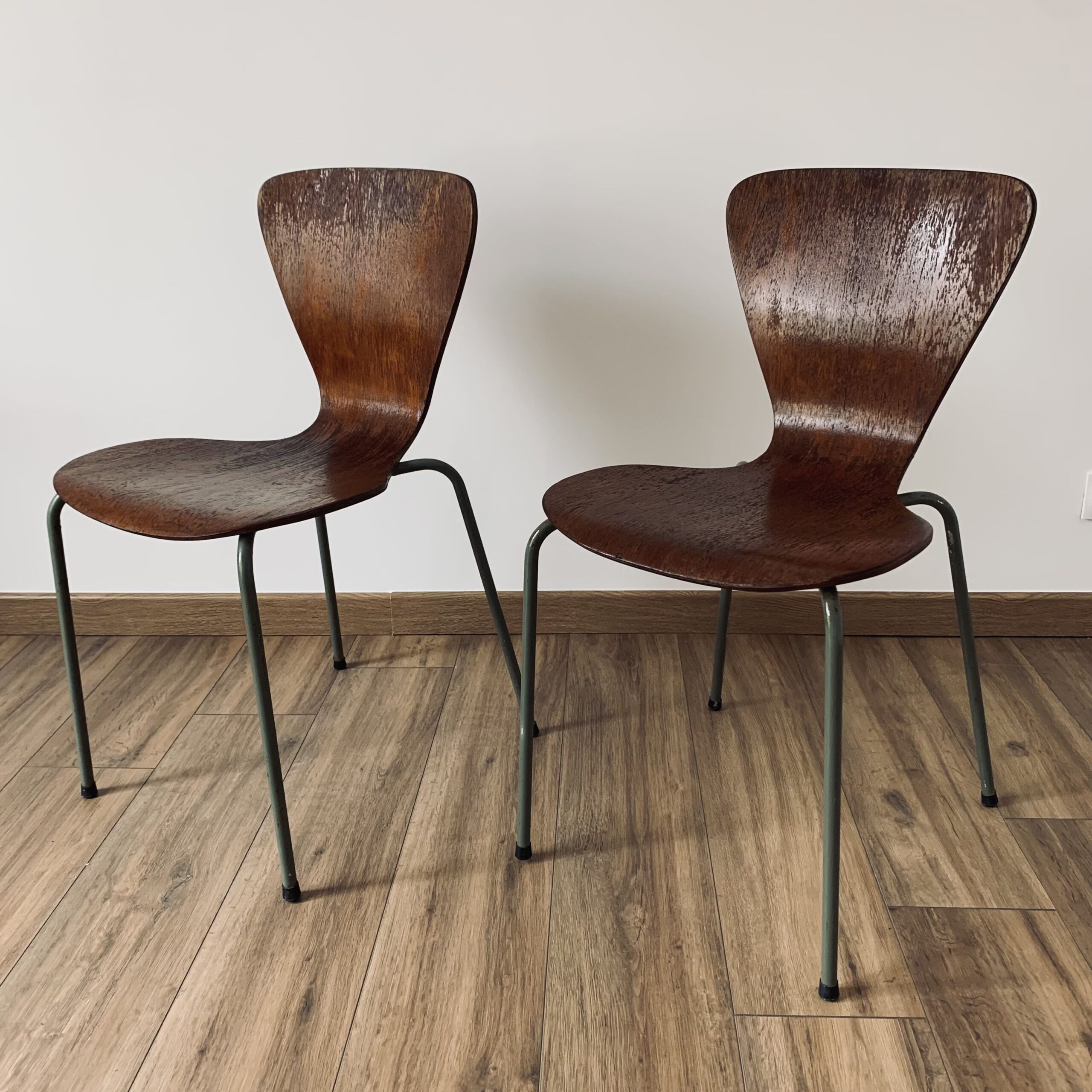 2 très jolies chaises design attribué à Arne jacobsen – Structure métal – Assise et dossier en bois courbé – Jolies formes arrondies du bois courbé – Socle central en métal assemblent le piètement tubulaire vert grisé – L’absence de vernis sur le bois apporte un charme supplémentaire à la chaise – Autres marques/traces du temps et d’usage dont rayures dont une importante à l’arrière d’un des dossiers, décolorations, absence de peinture, traces et points de rouille par endroits + taches de peinture blanche- présence de tous les patins – Stables et solides – Ces chaise sont un petit bout de design dans le style industriel