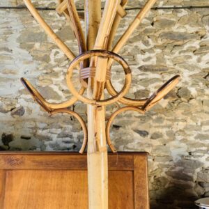 Avoir du rotin chez soi, c’est cool ! Porte-manteau perroquet 1950 en osier – 1, 82 m de haut – 8 portants, dont 4 avec boule bois – Dans son jus – En bon état général, quelques traces d’usure qui lui apportent tout son charme et son authenticité. Tressage/liens en bon état général – Stabilité à revoir – {hauteur: 182cm – diamètre au pied: 56cm – diamètre au portant: 41 cm}