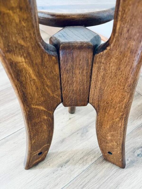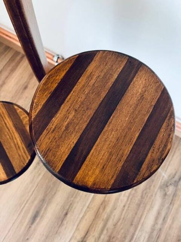 Ce porte-plante à trois niveaux allie élégance et design grâce à ses courbes fluides et harmonieuses. Chaque plateau, finement marqueté, ajoute une touche de sophistication et met en valeur les plantes qu’il supporte. La structure en métal noir ou doré offre une robustesse discrète tout en restant visuellement légère. Les niveaux étagés permettent une présentation en cascade, idéale pour une décoration intérieure raffinée. Parfait pour sublimer un coin de salon ou une véranda avec un charme contemporain – quelques traces du temps et d’usage dont taches, rayures, décolorations, frottements, coups, 1 éclat dans le bois au pied et autres marques