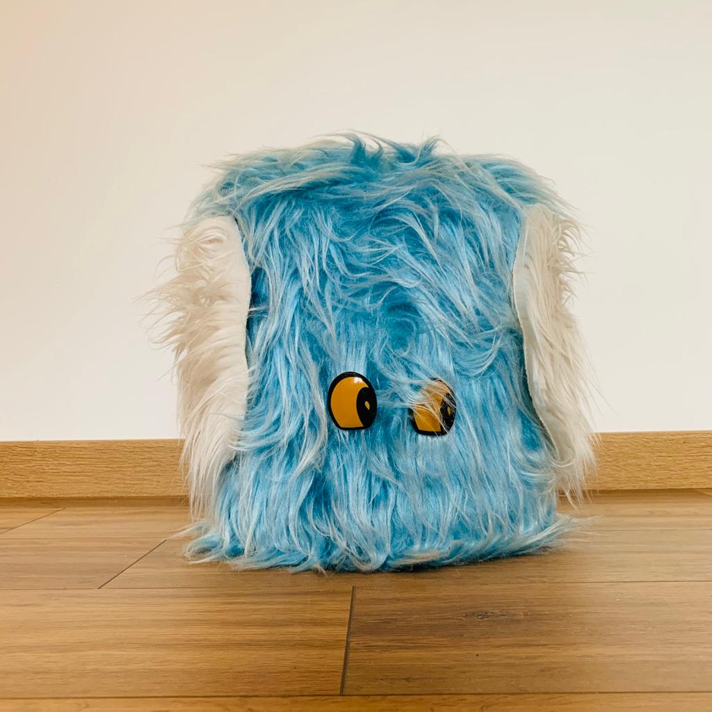Très joli pouf et coffre à la fois, représentant la tête d’un chien, couleur électrique, poils longs – Très bon état