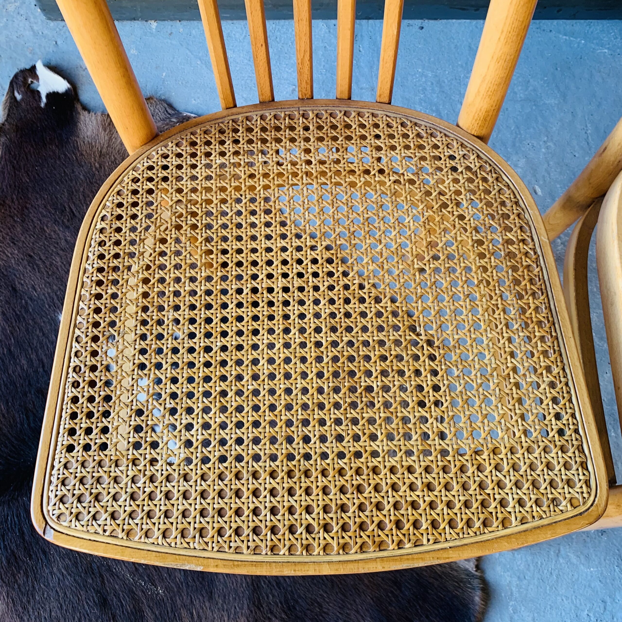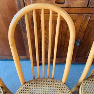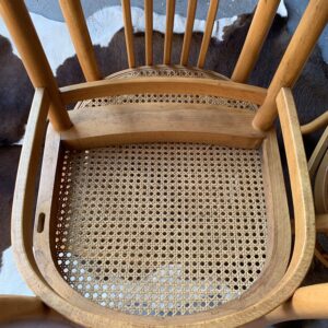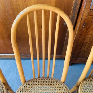 Suite of 4 unstamped baumann cane chairs, eden model – Caning in very good condition – Traces of time and use including 1 chip (photo), some reinforcement bars under the seat dismounted which do not affect the stability, some natural cracks on the backrests in the curved wood, varnish chips in places, veneer chips around the edges of the seats – Some stains, discolorations and marks – Good general condition, presence of protective caps on the legs of the chairs