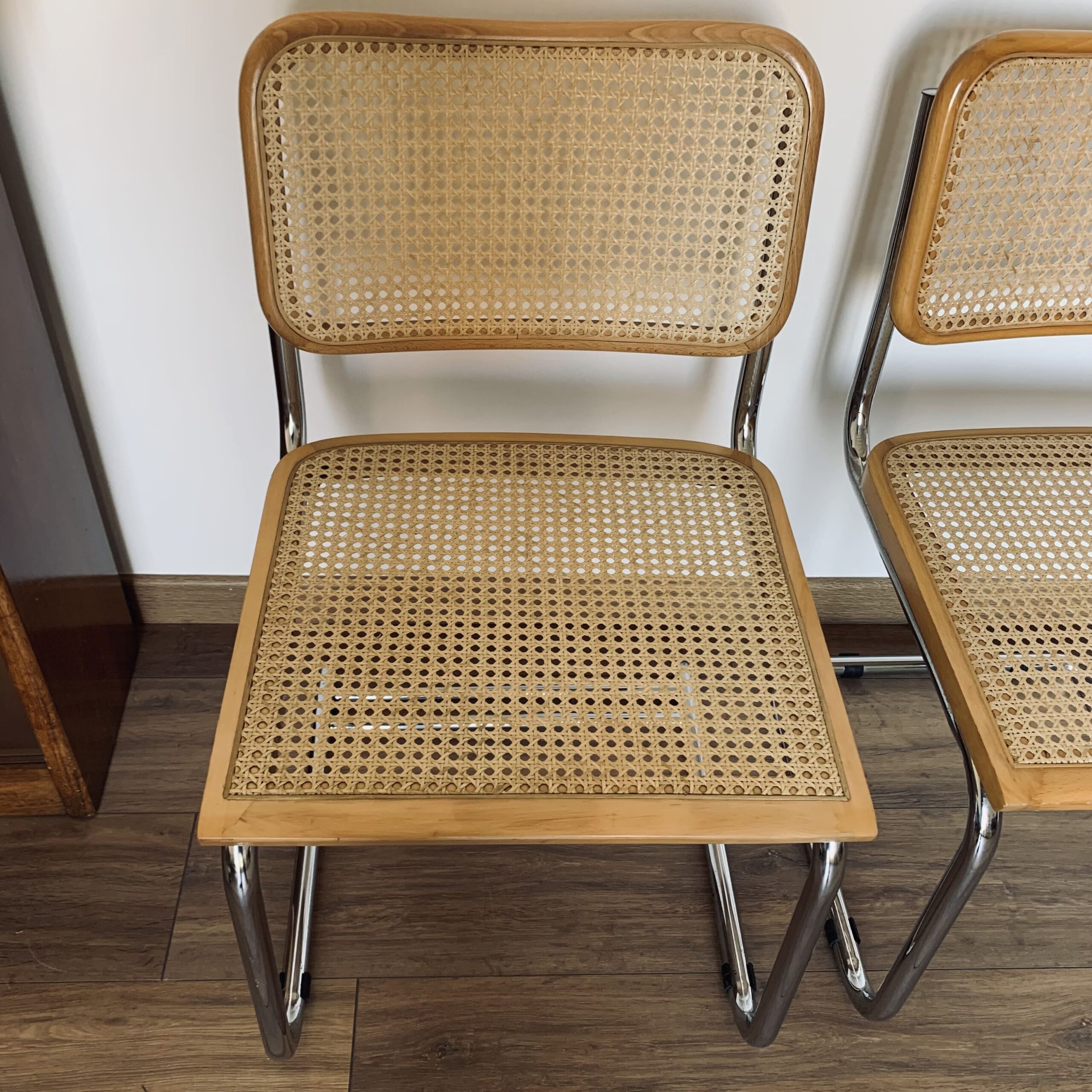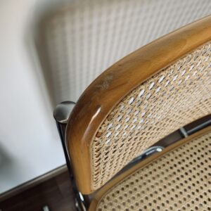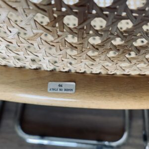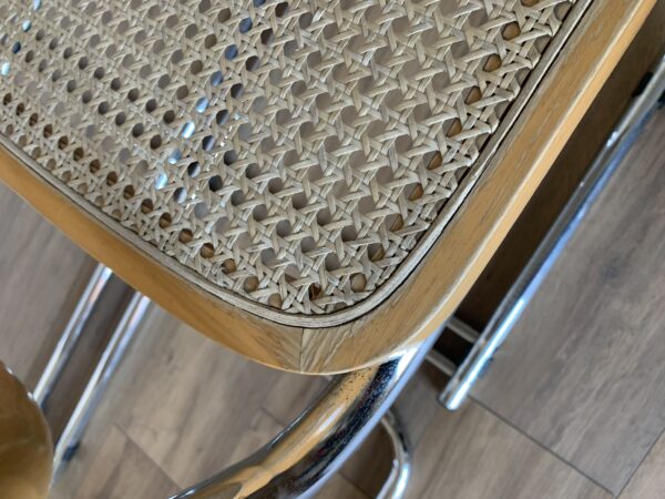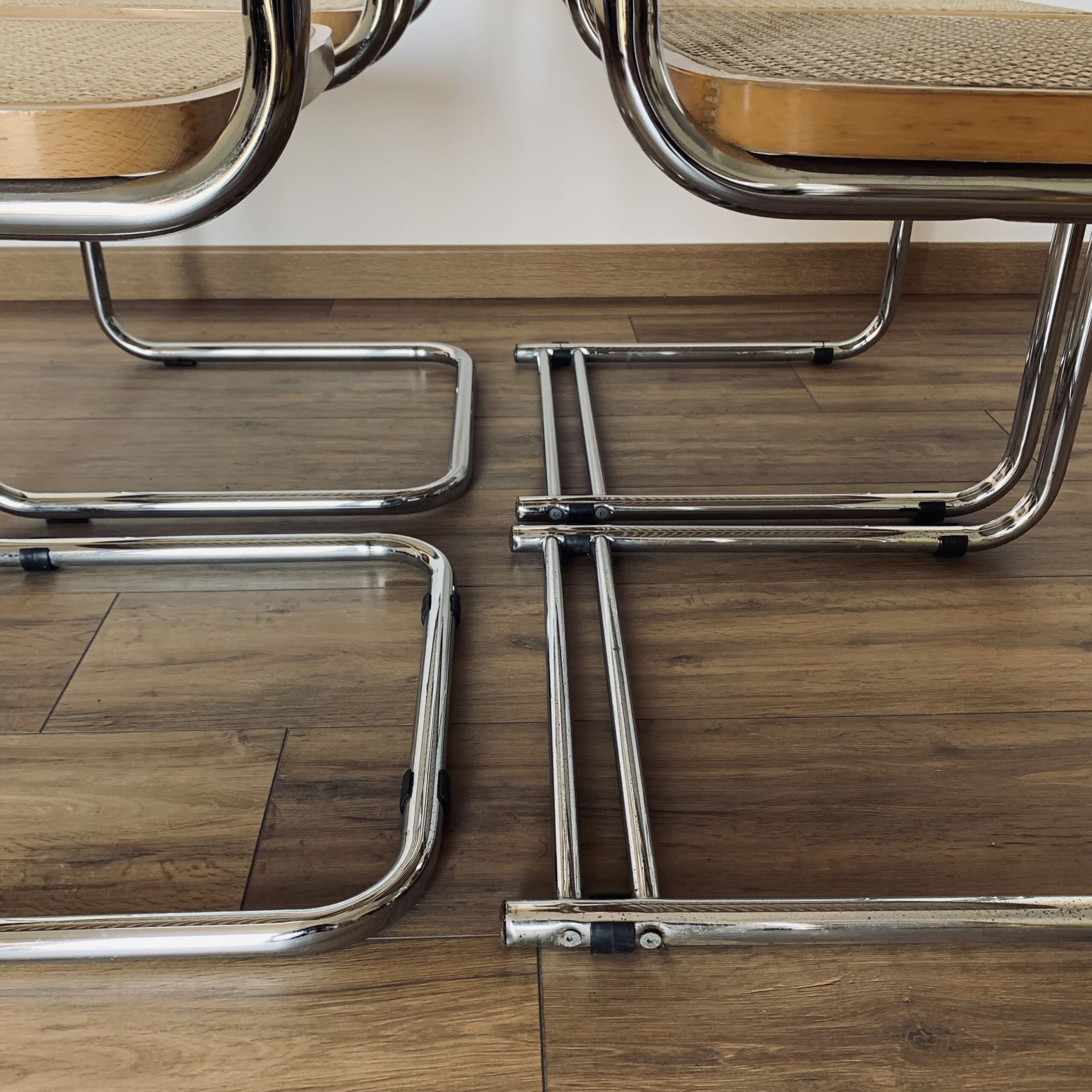 Lot of 4 caned chairs including 2 B32 chairs by Marcel Breuer and 2 other chairs with a particularity: The double leg – Uncommon – Tubular structure in chromed steel – Caning in good general condition – Marks & traces of time and use including scratches, shocks, pitted chrome and presence of traces of rust in places (and we can surely still reduce these marks before they leave) – Design chairs – Beautiful patina – Good general condition – Timeless!