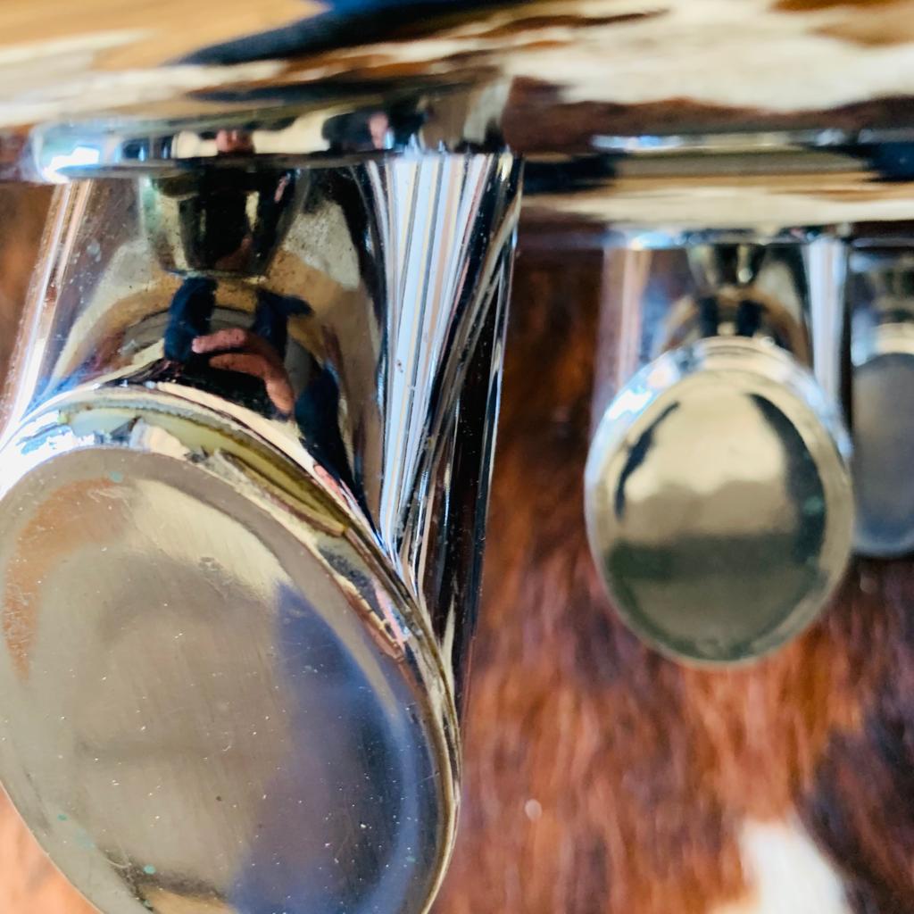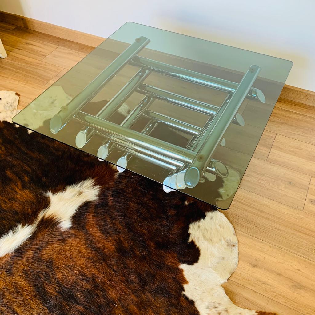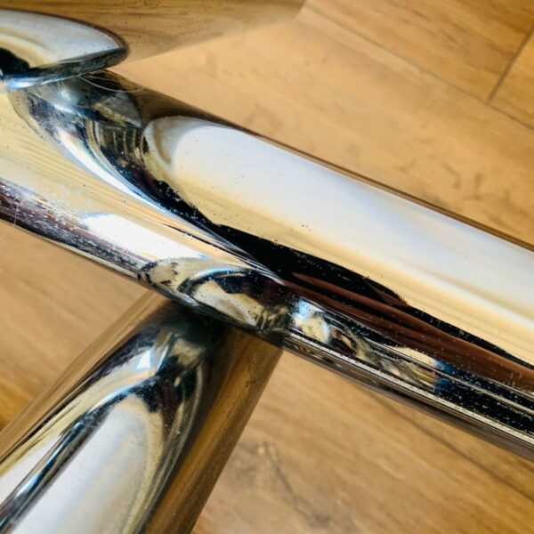 Table basse des années 1970 – Structure tubulaire chromée, plateau en verre marron/noir arrondi au niveau des angles et ventousé à la structure – Chrome en bon état, des rayures sur le plateau, chrome piqué à certains endroits de la structure, petits manques de chrome à certains bouts des tubes de la structure, bon état général