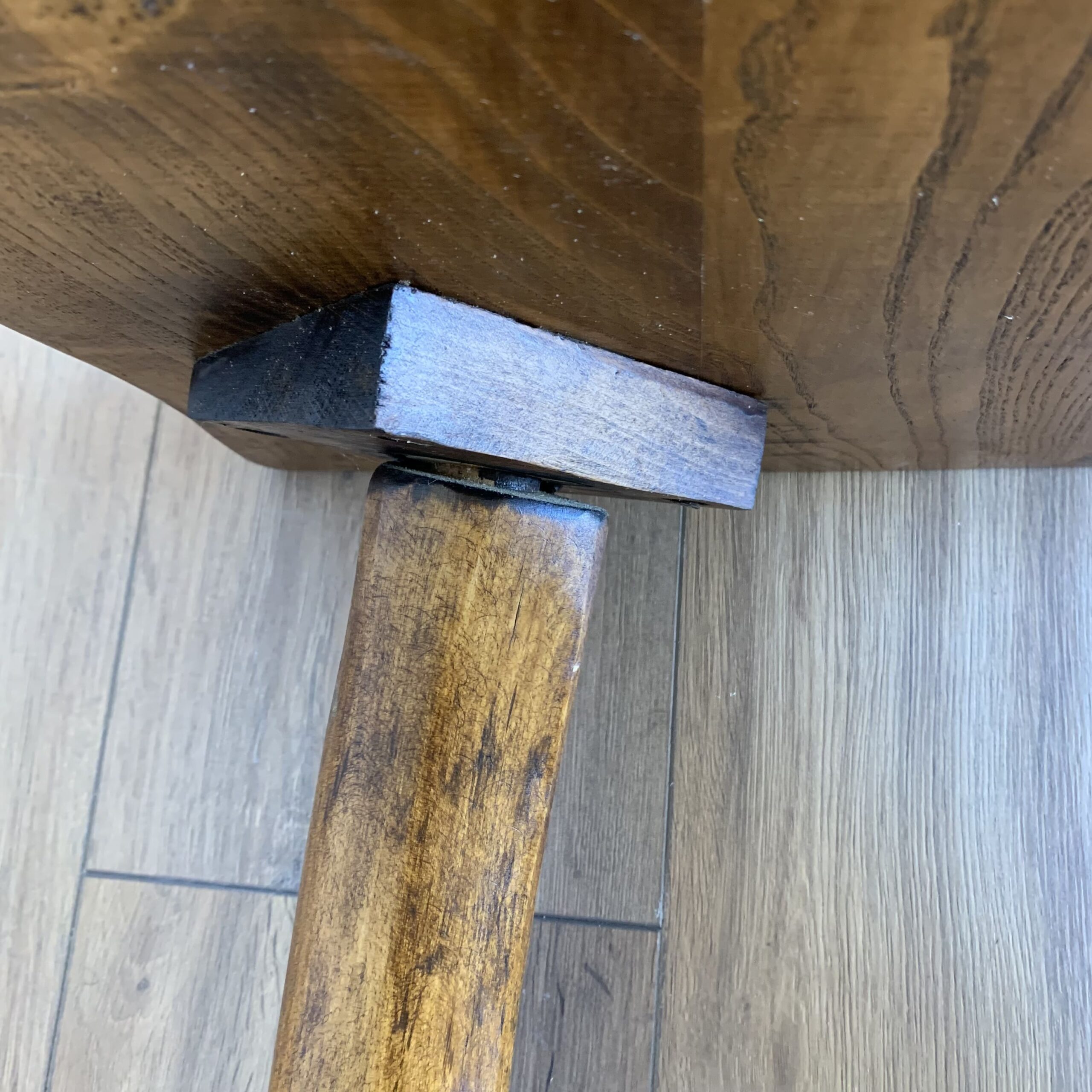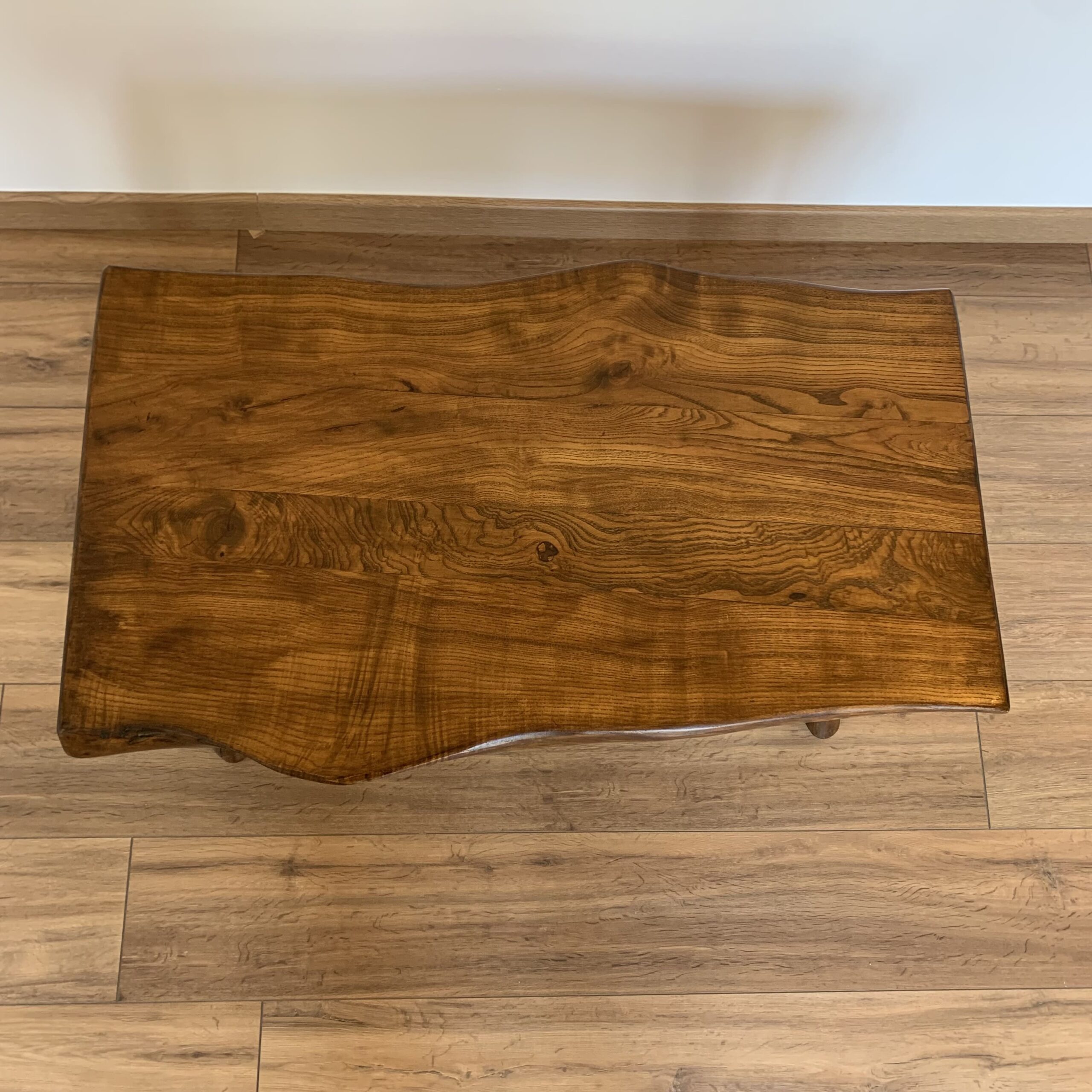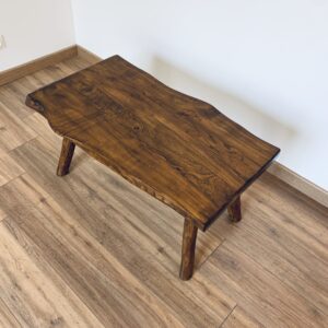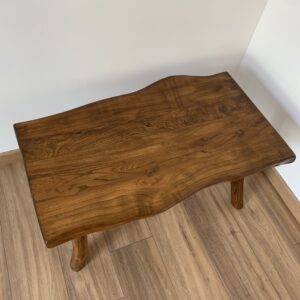 Table basse rectangulaire, lignes brutalistes – structure bois – pieds ronds encastrés dans supports vissés à la table – traces du temps et d’usage qui apporte caractère et authenticité à ce charmante table ( tous les petits défauts sont visibles sur les photos) – présence de plusieurs fissures naturelles qui ne remettent pas en cause la stabilité du meuble – bon état général