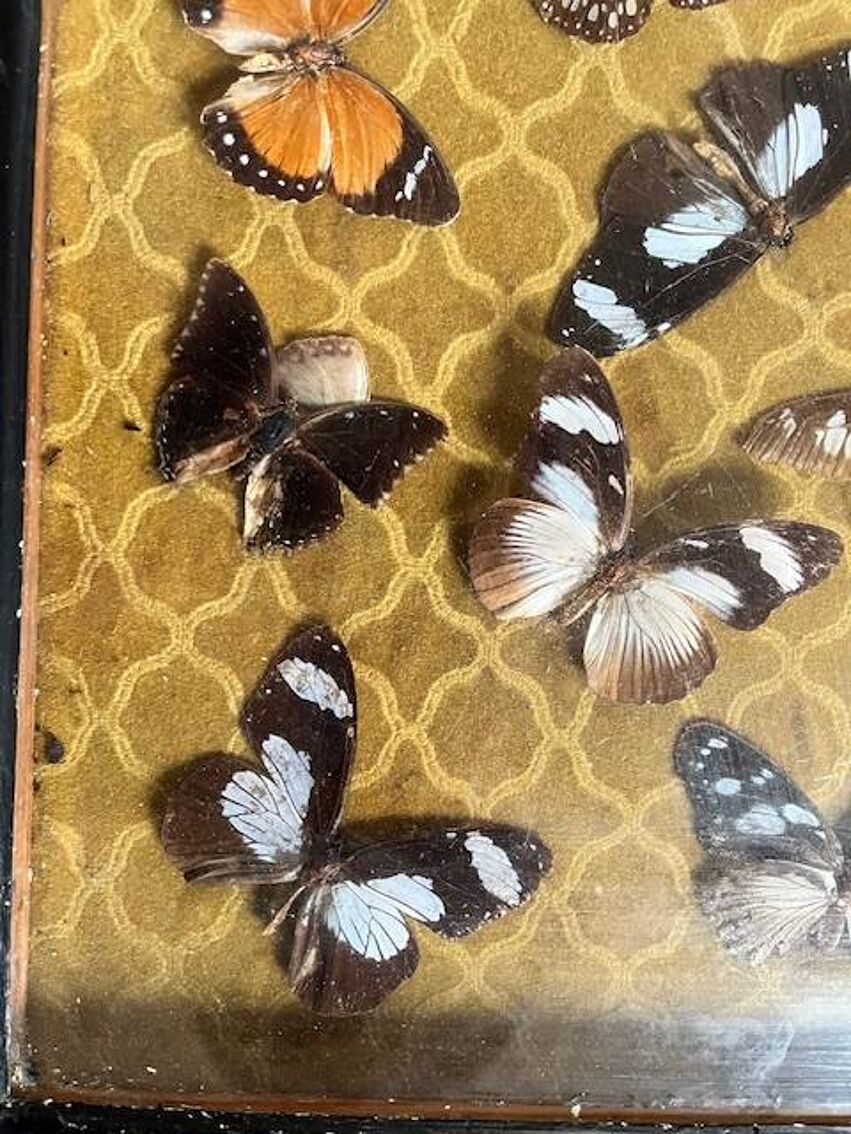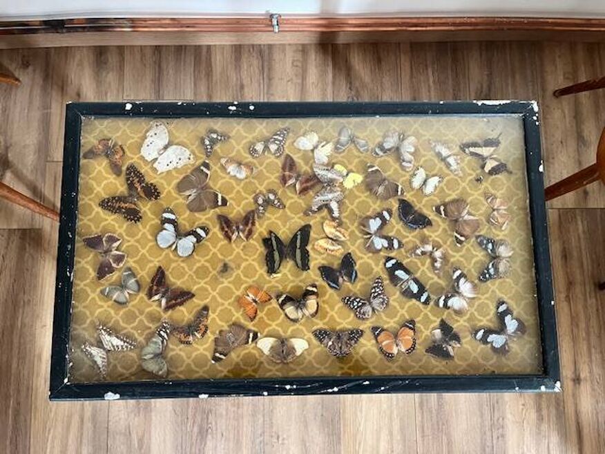 Table basse qui expose une collection de papillons sur un fond vintage jaune velours. Parfaite combinaison de fonctionnalité et esthétique pour une ambiance unique dans votre salon- structure métal, cadre en bois. Quelques traces du temps et d’usage dont taches, rayures, saletés, 2papillons déplacés sous la vitre, éclats/ manques de peinture par endroits et autres marques