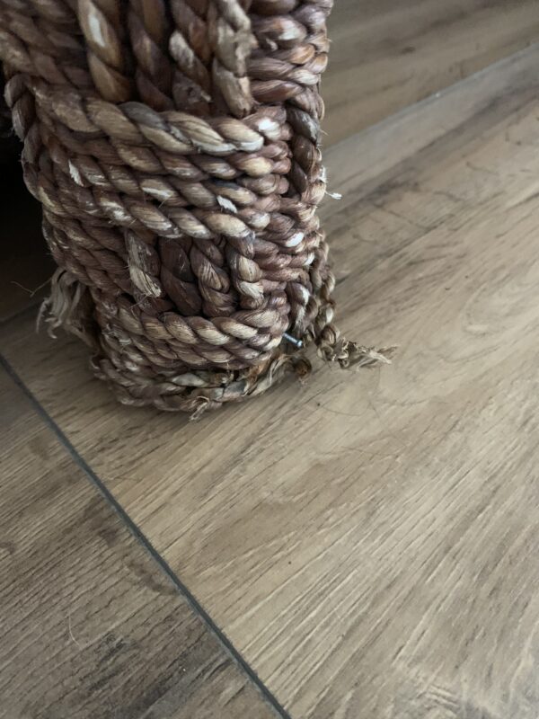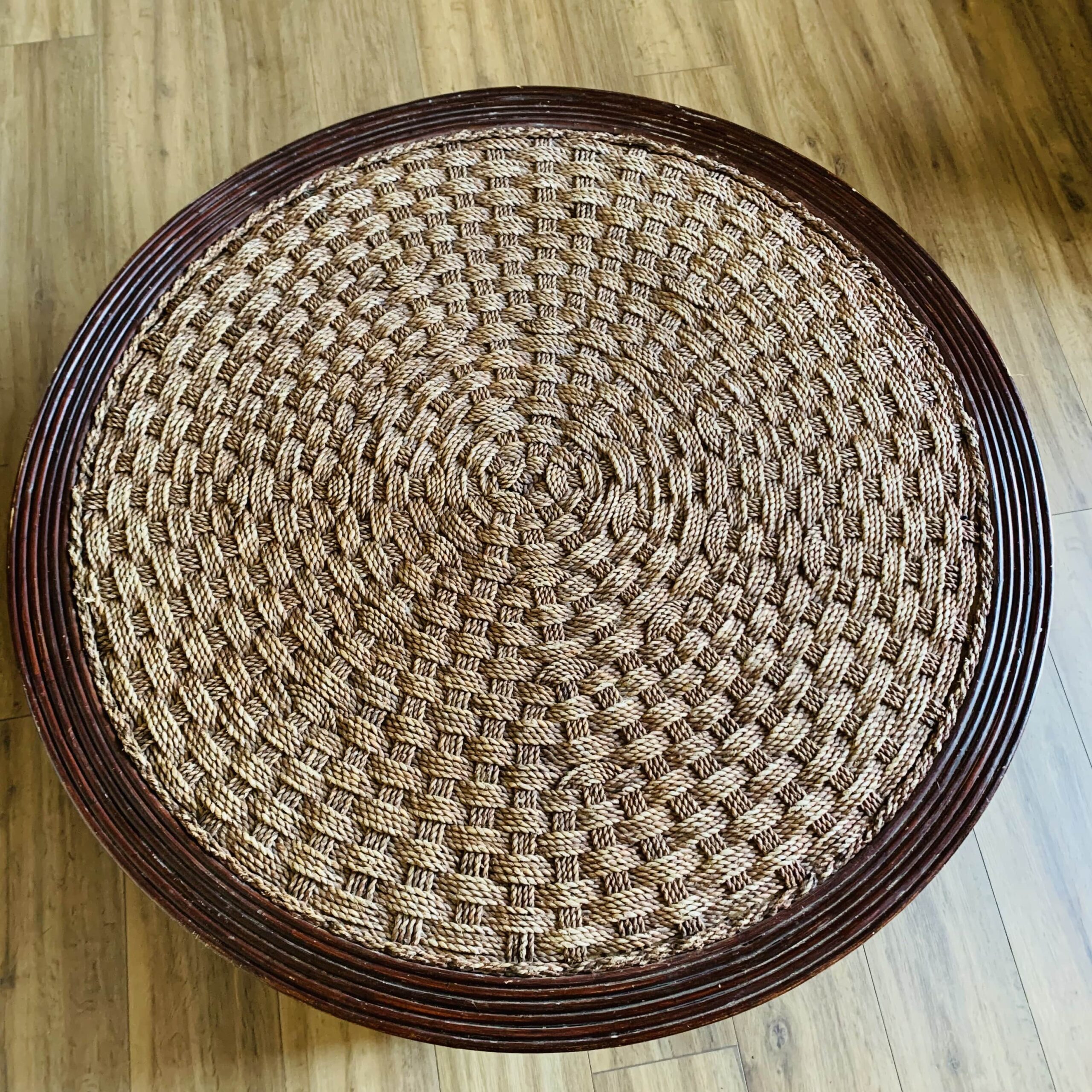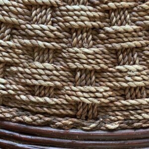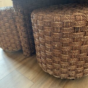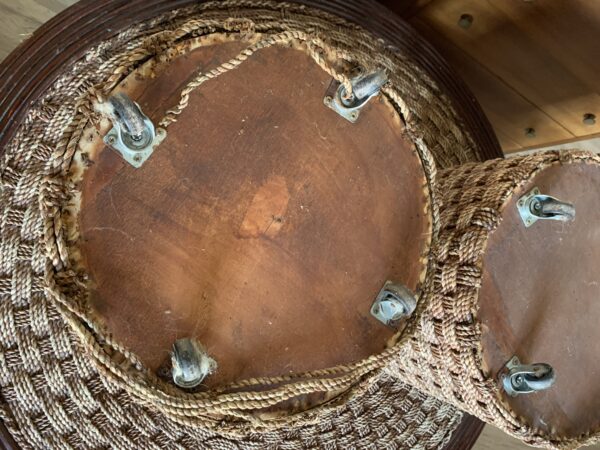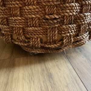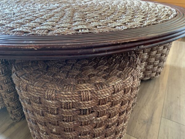 Un ensemble en bois et corde composé d’une table basse et de quatre tabourets. Design de ou dans l’esprit d’audoux minet. Le piétement (en forme de X ) de la table soutient un plateau rond cerclé de bois sous lequel les tabourets viennent se glisser. Les tabourets sont entièrement habillés de corde, des roulettes sont présentes sous la base – Quelques traces du temps et d’usage dont taches, rayures, décolorations, frottements, coups, cordage défaits, collés ou abîmés par endroits sur les poufs et autres marques