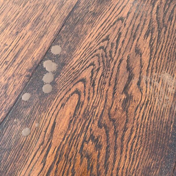 Très jolie table de ferme aux dimensions non habituelles. Table au charme intemporel qui s’accordera facilement à une décoration aussi bien vintage que moderne – Quelques traces du temps dont fissures, coups, petits manques de bois, tâches, trous de vers, décoloration et autres marques. A noter, une pâte marron a été ajouté sur les trous de vers à quelques endroits – Table traitée contre les vers