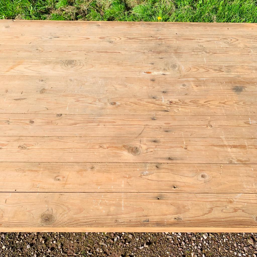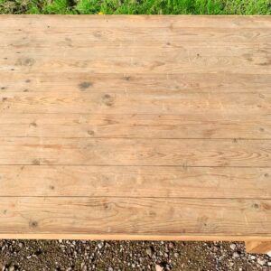 Belle table de ferme dans son jus – 2m90 de longueur – Pieds atypiques en chêne – Plateau composé de plusieurs planches de sapin – Table au charme intemporel qui s’accordera facilement à une décoration aussi bien vintage que moderne – Traces du temps dont taches de peinture, manques, trous de vers, rayures et marques- Table traitée contre les vers
